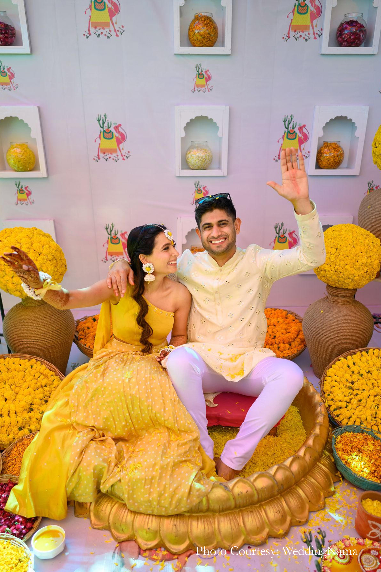 Staying in sync with tradition, the haldi decor consisted of pink, orange and yellow hues. Marigold blooms took a front seat in the decor while sunflowers by the poolside exuded a merry vibe. Brass urlis, a vast dancefloor and suspended garlands from the ceiling added a generous dollop of color to the celebrations and the phoolon ki holi.