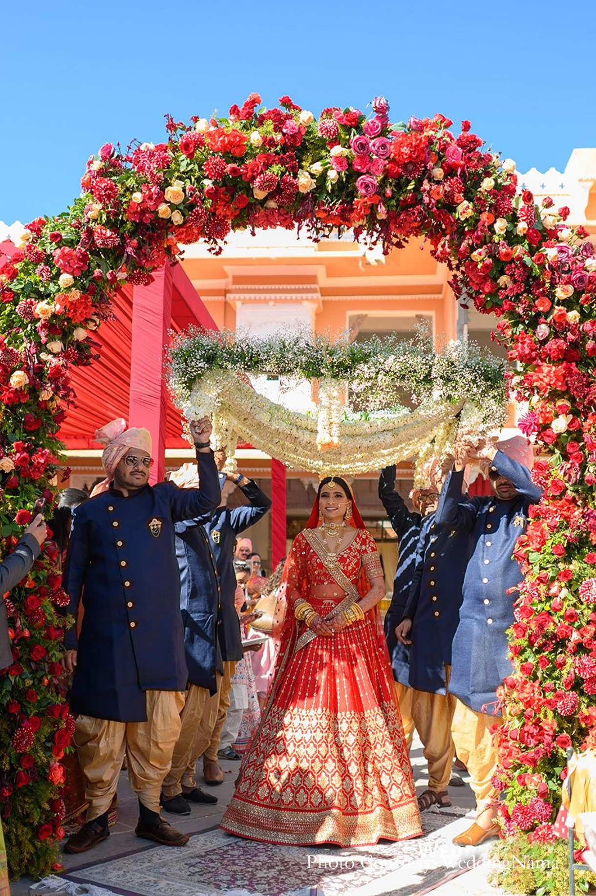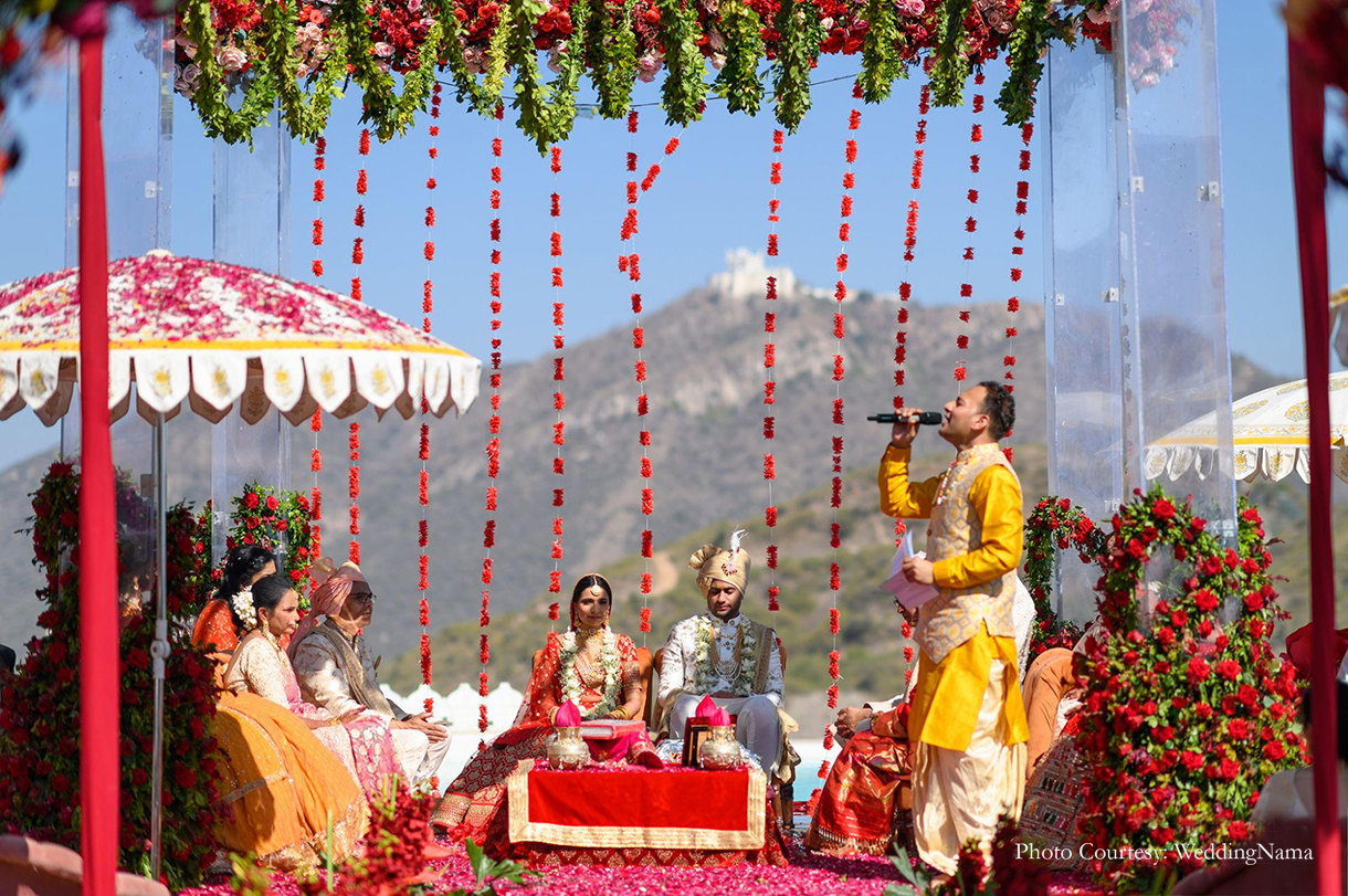 Jinal shares, “Under the sunny skies of Udaipur with the Aravalli range in the backdrop, Sachi and Arpit tied the knot. Every detail was carefully curated with scarlet roses adorning the mandap, the chrome floor of the mandap that mirrored the blue sky above and the translucent red drapes that sheltered the guests.”