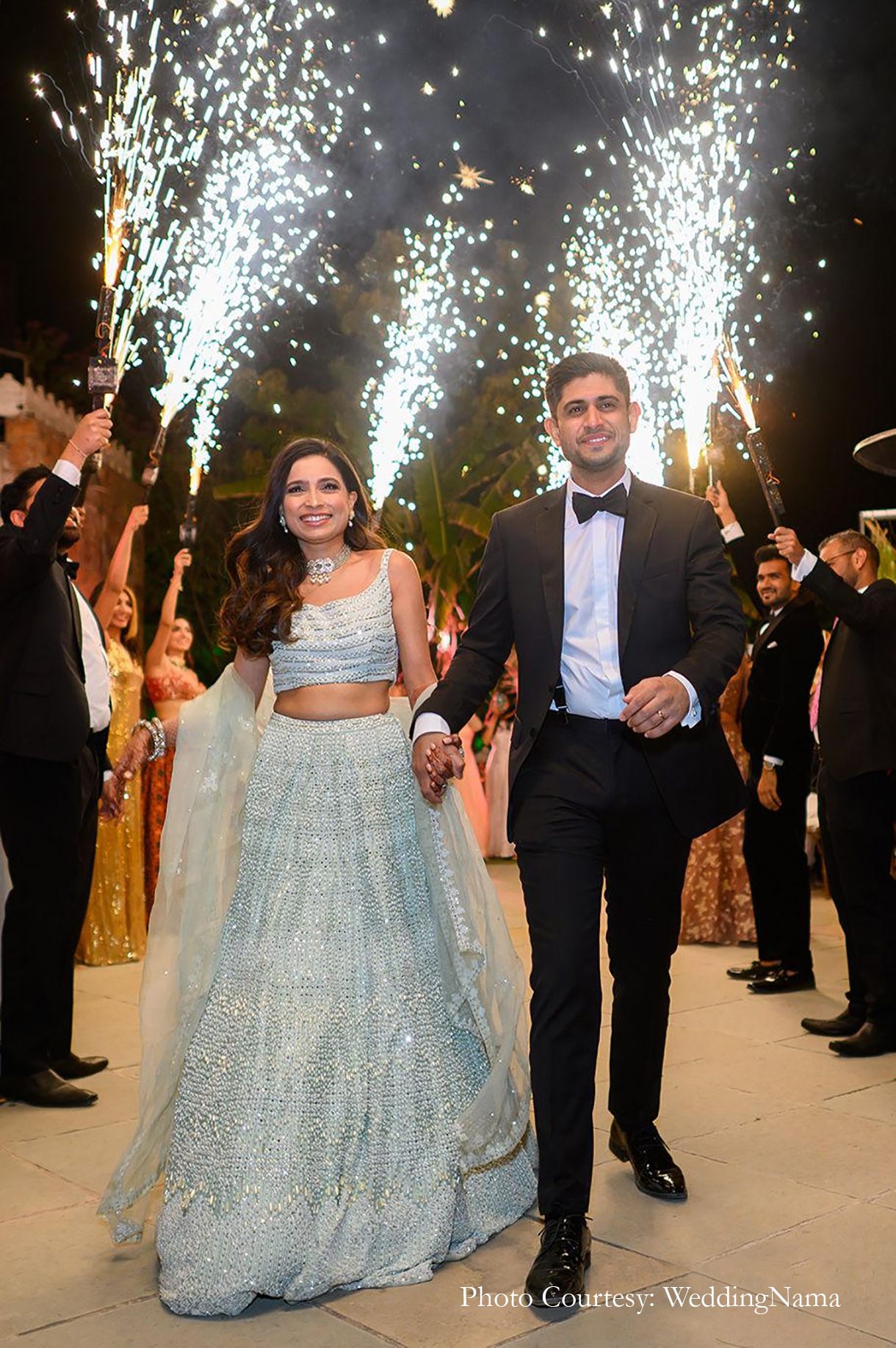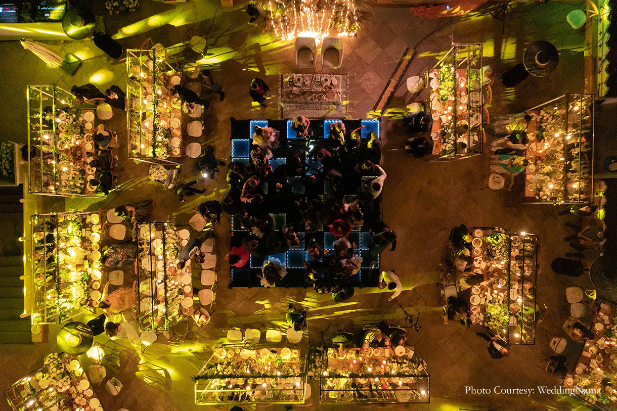 Making a dashing entrance with a blast of firecrackers and walking down the palatial steps hand-in-hand, the couple’s reception kicked off in style. As everyone revelled under the stars, vintage bulbs lit up the venue while the guests relished local delicacies by the pool.”