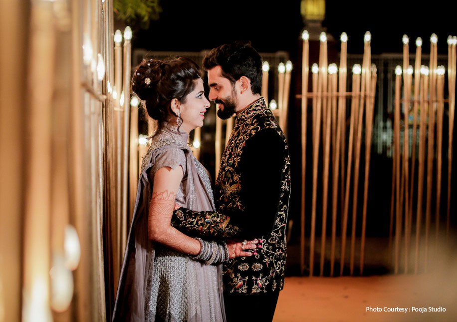 Our sangeet was hosted at Taj Umaid Bhawan Palace, Jodhpur and there was no particular theme – just elegant, chic décor. We had dozens and dozens of full-blown, red roses and soaked the venue in golden light. A huge LED screen made for the stage backdrop and our friends and family put up a series of lovely performances. The most memorable was when everyone wore masks with our faces printed on them. Shraddha Pandit was invited to sing at our sangeet.