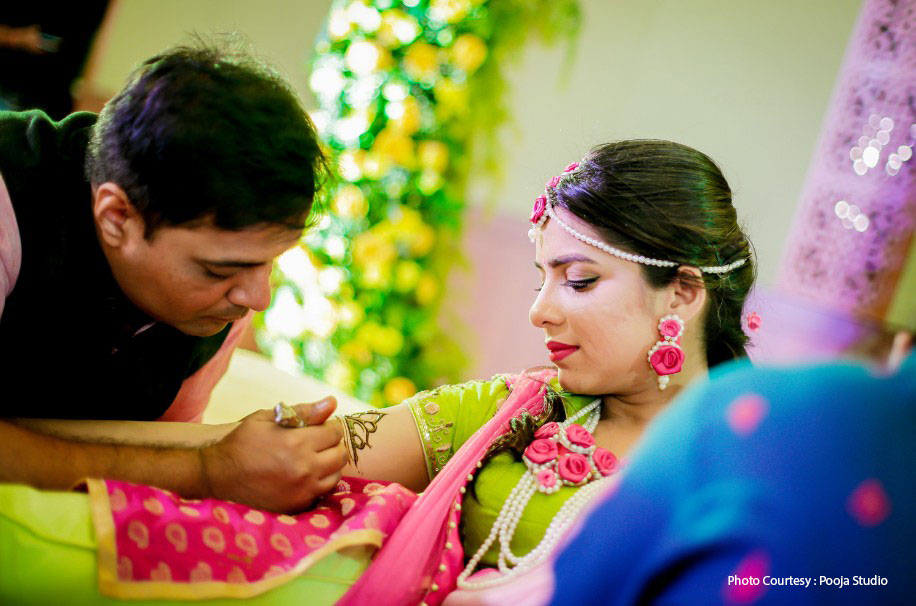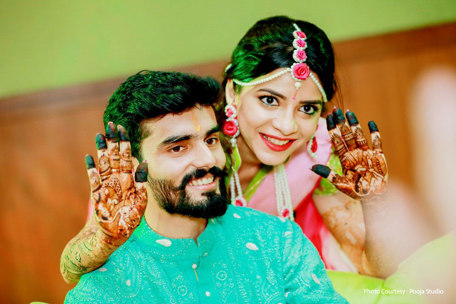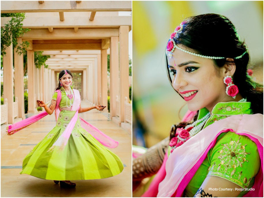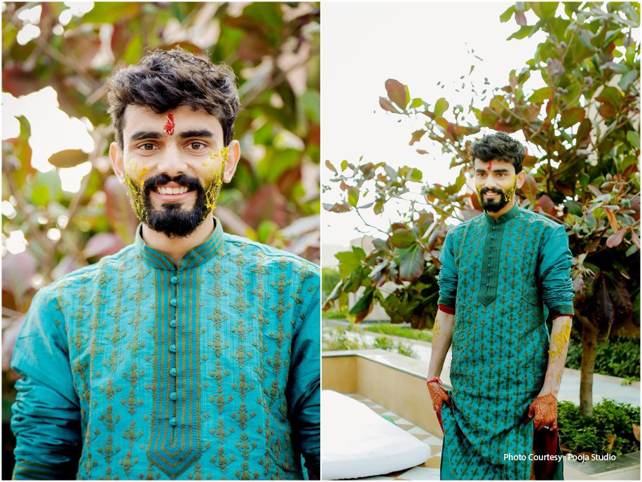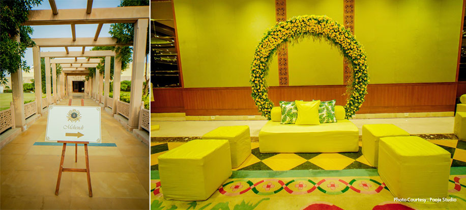 The wedding celebrations commenced with our mehndi which at WelcomHotel, Jodhpur. We wanted fresh hues for the décor so yellow and green were the colors of the afternoon. A pretty floral wreath was the backdrop for my seat and I wore a lehenga from Pallavi Jaipur in the same palette. Ankur looked handsome in a blue kurta.