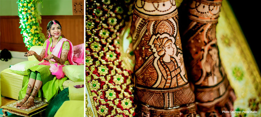 Bride’s Outfits: Pallavi Jaipur (Mehndi, Fusion Night, Youngsters Party, Haldi, and Pheras), Shantanu and Nikhil (Sangeet), Sabyasachi (Reception)