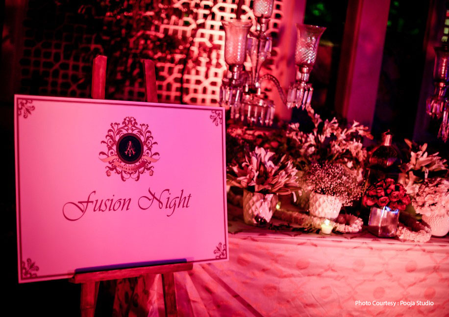 Our second event was a fusion night that saw Rajasthani as well as Sufi performances. We invited Kalbeliya dancers for this function as well. The space was decorated in red and white and the decor looked gorgeous. I wore a white gown from Pallavi Jaipur and Ankur opted for a blue outfit again.