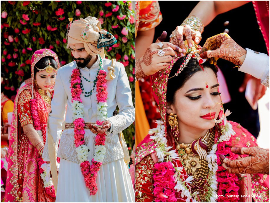 Ankur wore a red tuxedo from Nine Styles and I opted for a white gown from Pallavi Jaipur.