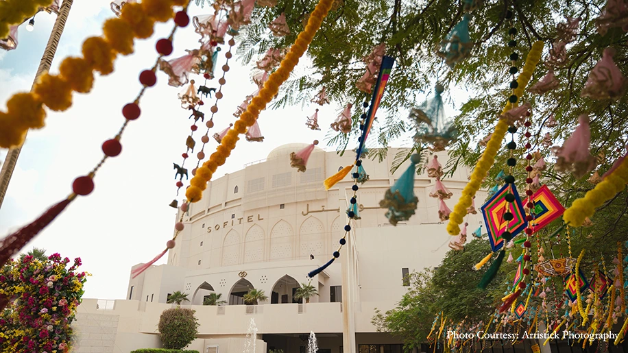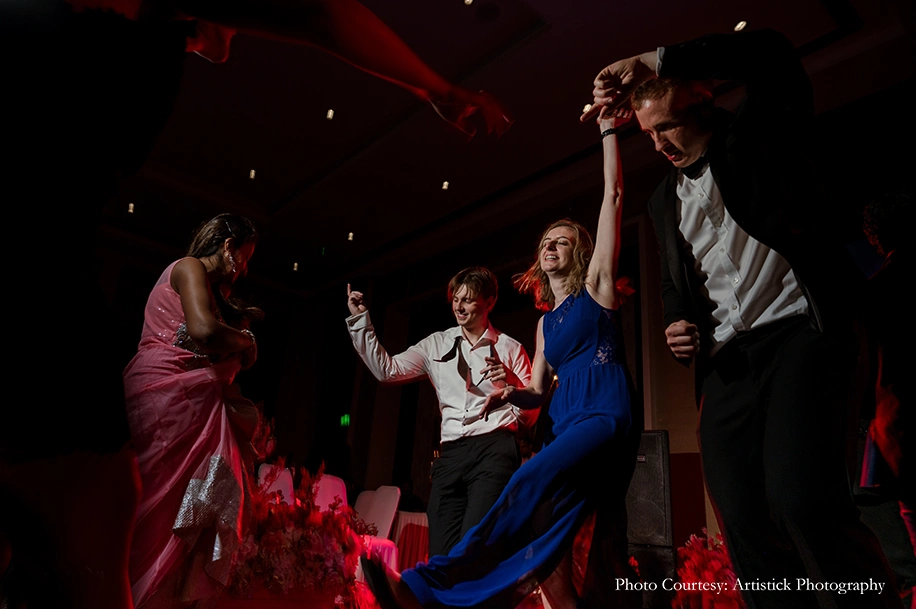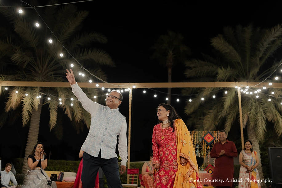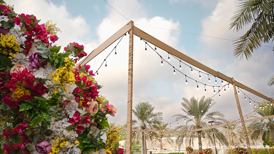 While the bride and her family members had their Mehndi the previous night, it combined the Sagai and Sangeet festivities for an explosive colorful bash full of merriment. The vibrant decor included tassels, marigolds, flower arrangements, colorful cushions, lounge lights and more. The rousing revelries included the engagement rituals, party games, couple games and many dazzling performances, while mehndi was being offered to the guests in the background. The MC kept the entertainment and energy of the festivities high, seamlessly bridging every part of the evening to ensure guests, including the International ones, enjoyed every moment.