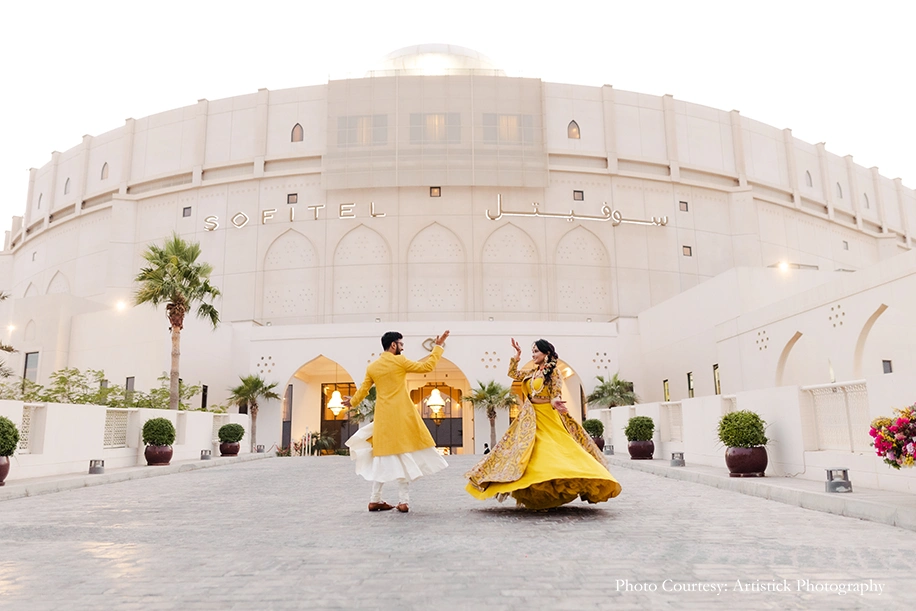 The traditional festivities were given a Bahraini twist by including enticing local flavors into the menu, as well as attractions such as a falconer and calligrapher courtesy of BTEA. Mehndi favors such as bracelets and more, added a special touch for the guests to take home. The couple flaunted vibrant, high fashion ensembles in bright yellow for the occasion.