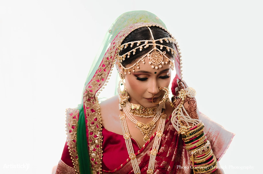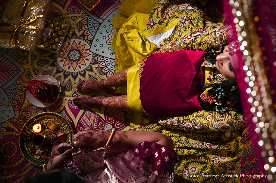 The bride wore her mother’s Banarasi wedding saree with a green dupatta for a pop of color. The groom complemented her by teaming his white sherwani with a green shawl and safa. Like the Sagan, the function was hosted by an MC who could explain the significance of every ritual to the guests. The menu included a mix of Indian and Chinese cuisines, and the couple ended the celebrations with traditional couple games.