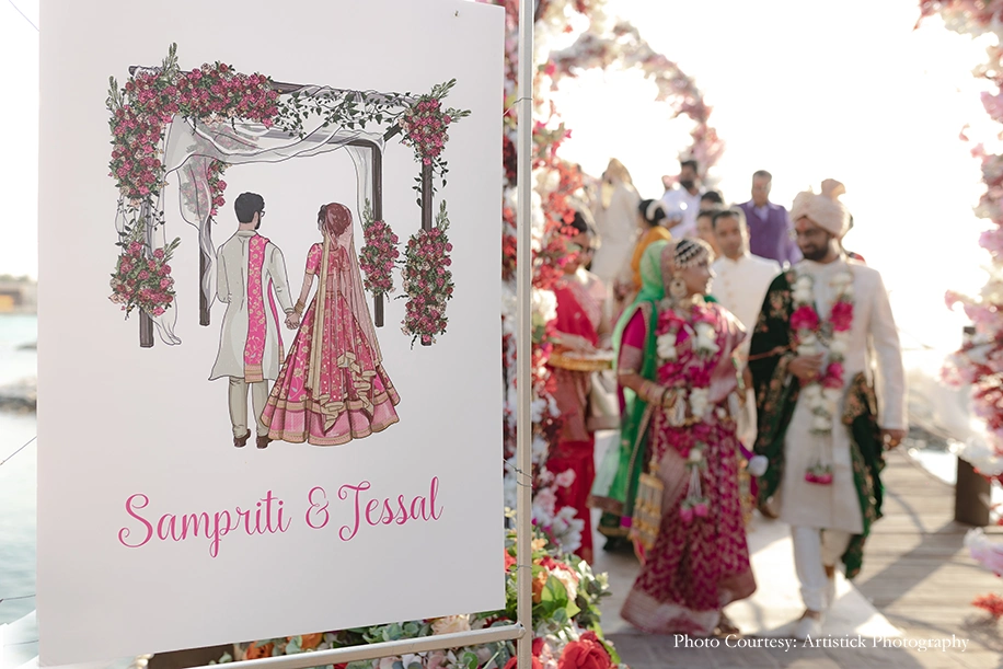 The couple decided to host the wedding in the bride’s home location of Bahrain for ease of planning. They chose to host most of their functions at Sofitel Bahrain Zallaq Thalassa Sea & Spa to match the bride’s vision of an Island wedding. The entire planning of the celebrations from end to end was meticulously managed by Sampriti’s parents who ensured they included everything that the bride and groom desired.