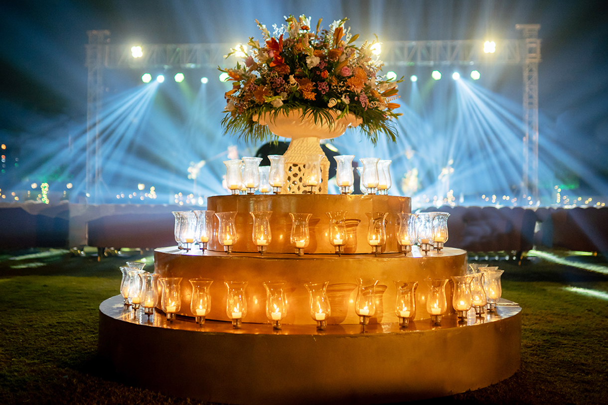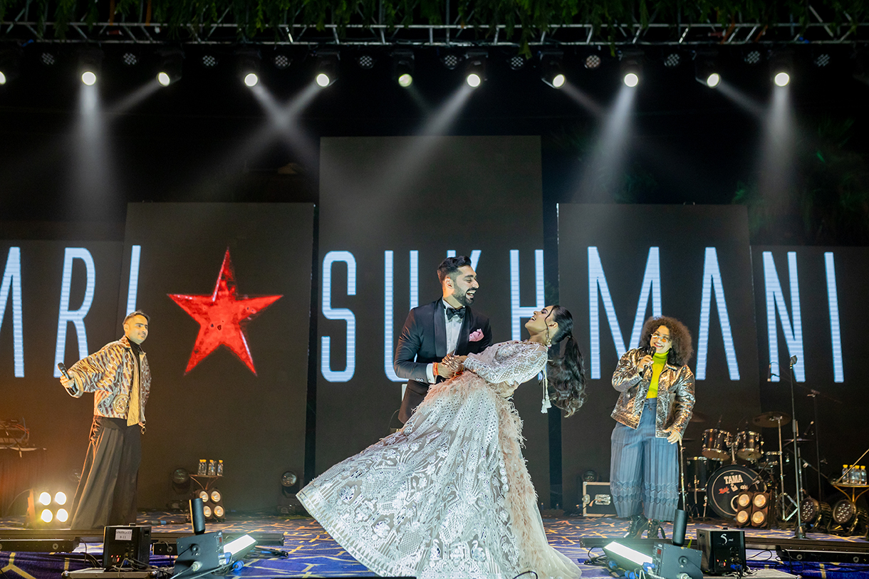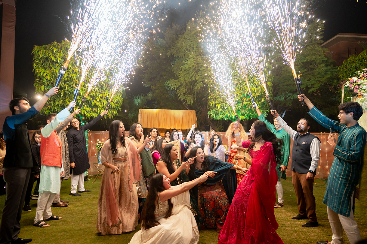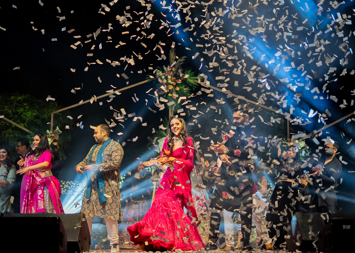 Ajay and Purvi Modgil from F5 Weddings share “Sanjika and Keshav wanted their wedding in all aspects to be a reflection of their personalities to have the emotions towards it, not just for themselves but their guests too. We made sure to do just that for them. This larger-than-life wedding in Agra welcomed over 800 guests across all functions and over 2000 guests at the Sangeet. We took pride in designing, planning, and flawlessly executing this magnificent celebration, creating unforgettable memories for everyone involved. With the couple’s priority on guest entertainment, we ensured a stellar lineup of artists for every function, managing logistics and fulfilling all requirements seamlessly. From small to grand events, every moment was filled with captivating performances, delighting guests throughout the celebration. Innovatively enhancing guest experience, we replaced traditional room hampers with DIY hampers, allowing guests to curate their delights at their convenience. This thoughtful touch was embraced by guests, providing them with personalised enjoyment throughout their stay. From fun stalls at the Mehendi to surprise dances and a grand entry at their cocktail with a towering champagne display, we ensured every small detail added extra sparkle to the festivities, creating unforgettable moments throughout the celebration.”