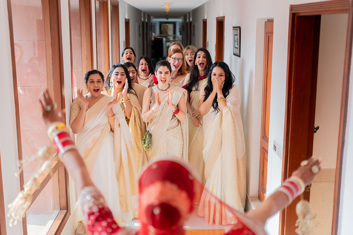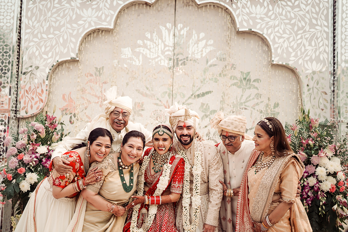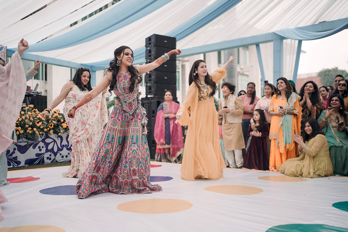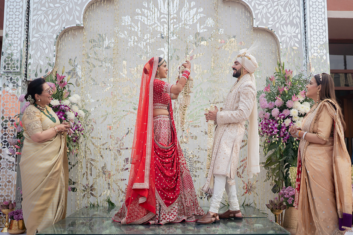 Ajay and Purvi Modgil from F5 Weddings share “Sanjika and Keshav wanted their wedding in all aspects to be a reflection of their personalities to have the emotions towards it, not just for themselves but their guests too. We made sure to do just that for them. This larger-than-life wedding in Agra welcomed over 800 guests across all functions and over 2000 guests at the Sangeet. We took pride in designing, planning, and flawlessly executing this magnificent celebration, creating unforgettable memories for everyone involved. With the couple’s priority on guest entertainment, we ensured a stellar lineup of artists for every function, managing logistics and fulfilling all requirements seamlessly. From small to grand events, every moment was filled with captivating performances, delighting guests throughout the celebration. Innovatively enhancing guest experience, we replaced traditional room hampers with DIY hampers, allowing guests to curate their delights at their convenience. This thoughtful touch was embraced by guests, providing them with personalised enjoyment throughout their stay. From fun stalls at the Mehendi to surprise dances and a grand entry at their cocktail with a towering champagne display, we ensured every small detail added extra sparkle to the festivities, creating unforgettable moments throughout the celebration.”