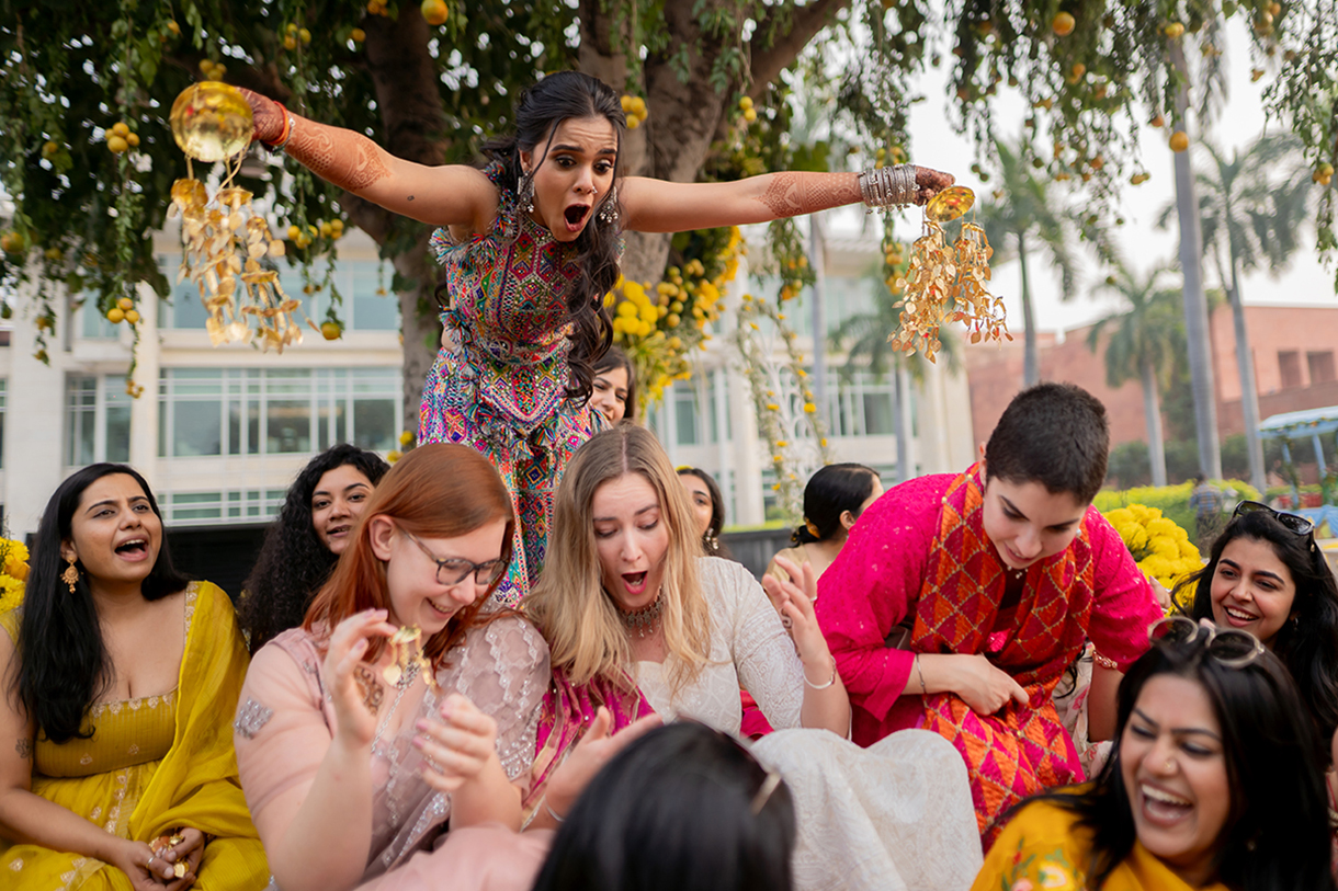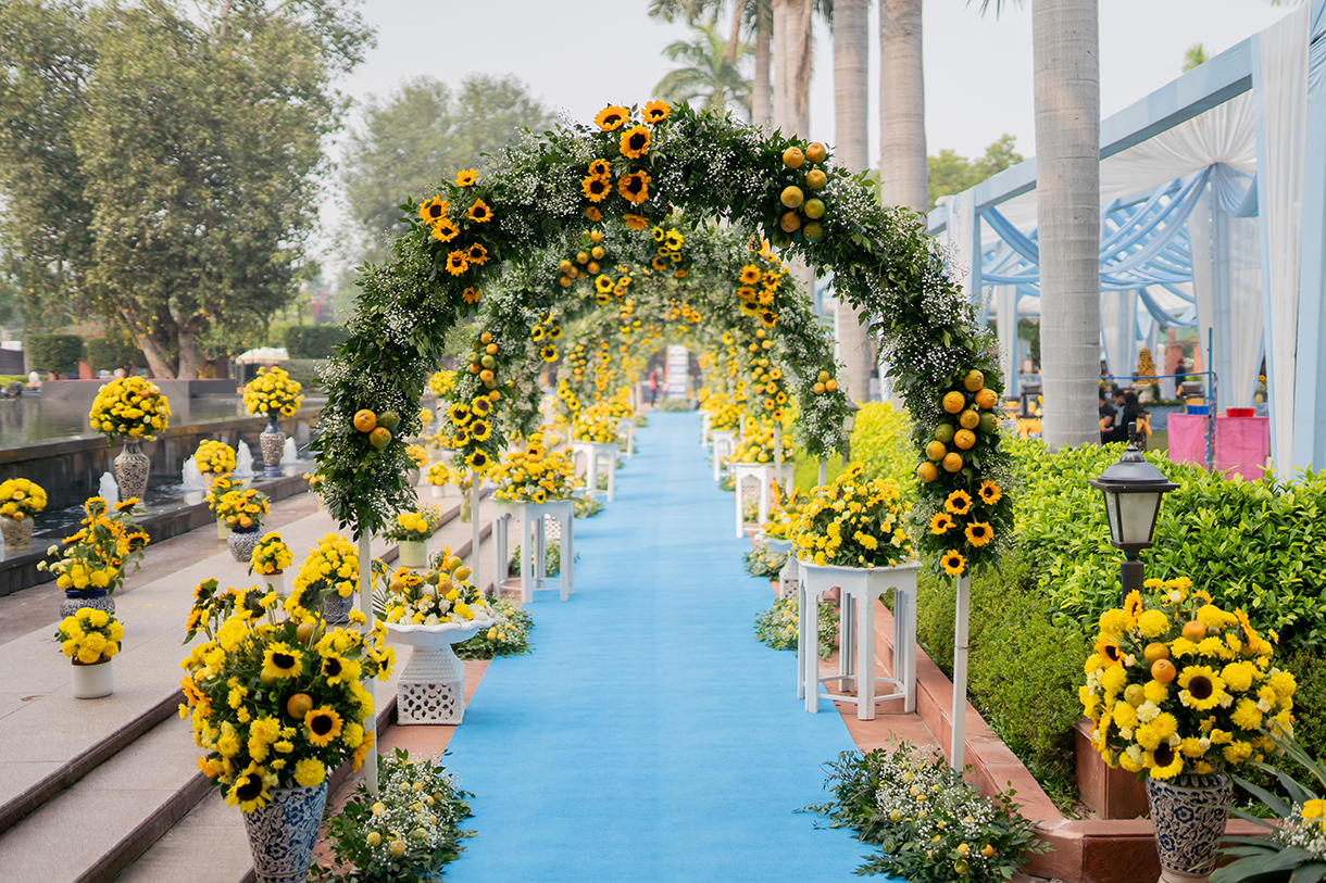 Inspired by the concept of an Italian brunch, the mehndi was the first event that was relaxing yet fun. Ajay and Purvi share, “We combined rich blue and yellow hues with lightweight linens and geometric patterns. Lemon motifs were key to executing this theme! We amped the venue with real lemons as centrepieces, and long wooden tables and created a limoncello favor wall for guests!”
