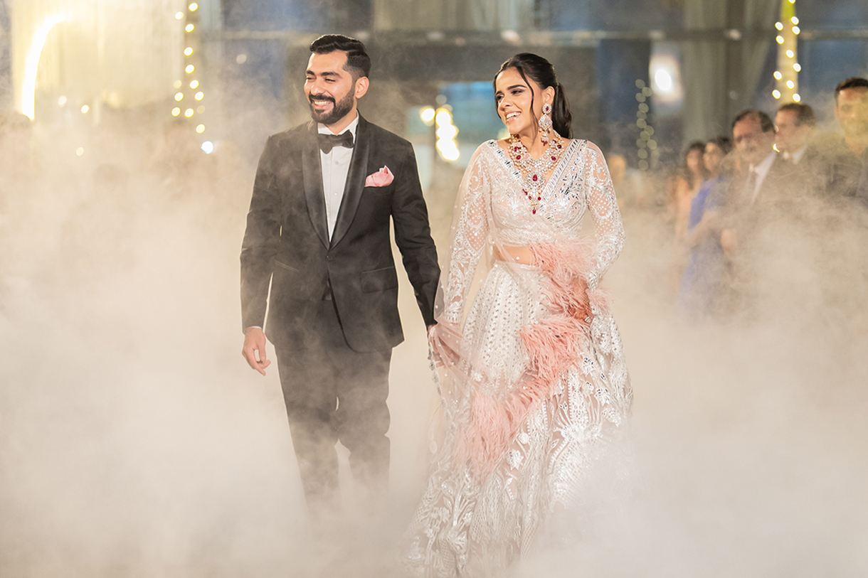 “The cocktail party was pure elegance! From large chandeliers, elegant lounge seating, grand mirror top tables with heavy floral work to a live band – everything was perfection! With over 200 lights creating an enchanting ambience, it is safe to say that each guest was left awed”, share Ajay and Purvi.