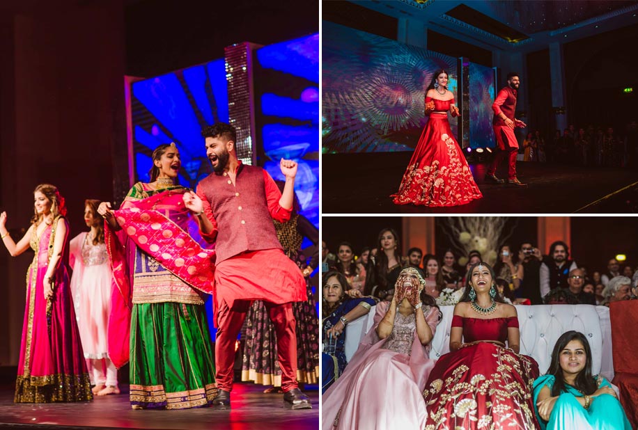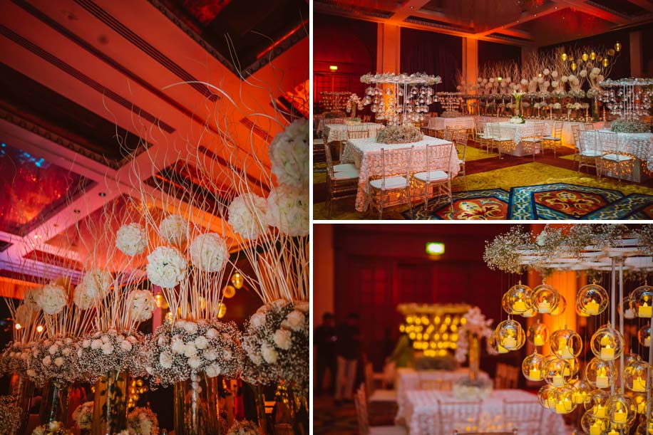 The engagement and sangeet ceremony was hosted in the ballroom at Al-Bandar Shangri-La, festooned with centerpieces crafted with luxurious, large white feathers. At the ‘Hangover Brunch’ the next day, specially concocted ‘Hangover Shots’ were offered to help guests recover their energy levels after the debauchery of the previous night.
