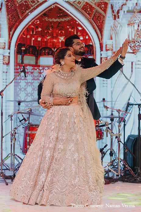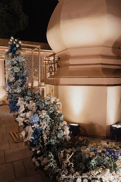 Saudamini shares, “Since this was to be hosted under a star-studded sky, we chose elegant colors in shades of blue, beige, peach, pink and white. Huge chandeliers were suspended from the central tree with the bar placed beneath it. The entrance corridor was also adorned with blooms and musicians who played traditional instruments to welcome the guests.” Priti Sidhwani from DreamzKrraft shares, “The bride and groom weren’t too keen on dance performances and hence the guests were treated to a solo song sung by the bride at the ring ceremony amidst heartfelt speeches made by the family. Following this, everyone took to the dance floor by storm as they danced the night away!”