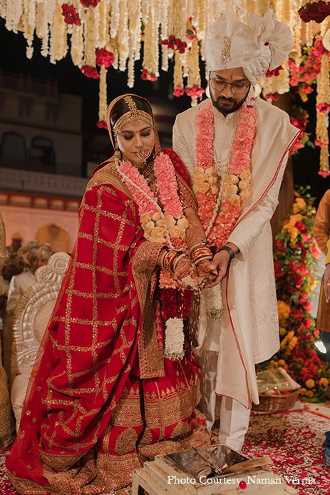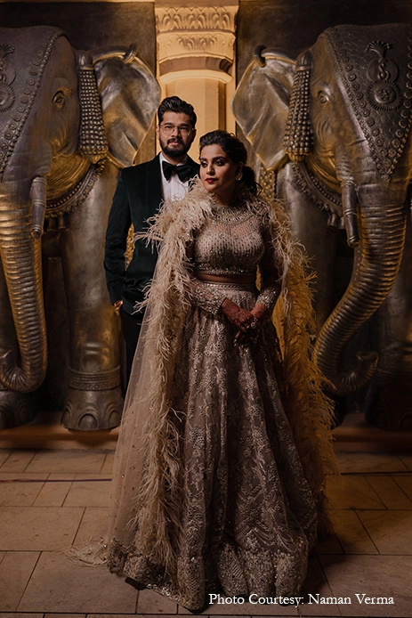 Architect and real estate developer Saudamini Shah’s union with Rushabh Shah was a joyous event surrounded by the majesty of traditional Indian architecture. Hosted at the breathtaking Rambagh Palace, Jaipur with the pleasant December weather pleasuring the senses, this wedding had it all – color, unique themes and heartfelt moments. Planned and decorated by WeddingSutra Favorite – DreamzKrraft this wedding won hearts with its highly detailed approach and mesmerizing play of hues!