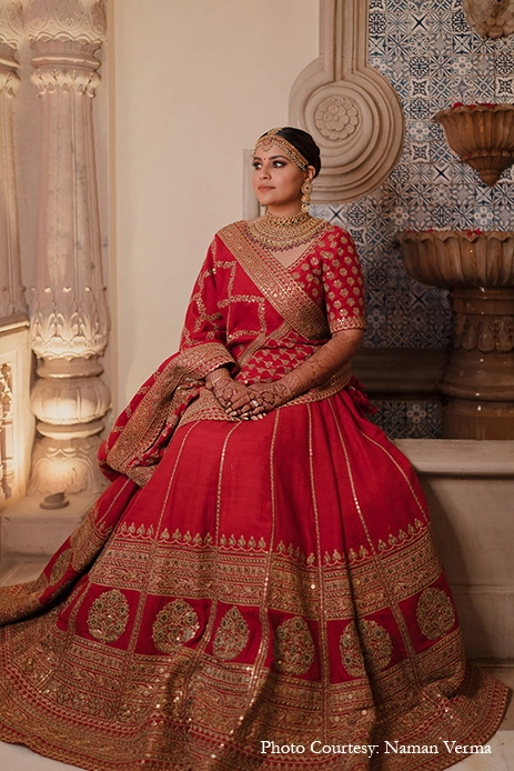 Saudamini shares, “Since we had to choose a venue amidst the pandemic, we made several trips to Rajasthan. After skimming through a host of cities and locations, we chose Rambagh Palace as it ticked every box on our list. Not only is it conveniently located but nothing quite compares to the sheer beauty of this amazing place! From the moment our families saw the venue, they were floored by the sheer beauty of its vast lawns and palatial architecture. It has a wonderful choice of venues to choose from, both outdoor and indoors. We had the liberty to choose exactly what we wanted due to the vast environs, and of course, a noteworthy mention of the hotel’s extremely helpful staff who were always at hand to assist us.”
