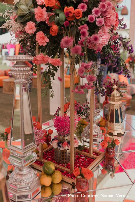 Orchestrated around the theme of ‘A Marrakech Fete’, the Mehndi was decorated by team DreamzKrraft flaunted punchy hues that shone brightly under the sun. The bride shares, “We chose super bright colors like orange and pink while the tables were laden with other colorful elements like fresh fruit and veggies. Mismatched prints added a dash of quirk while the beautiful backdrop lent a traditional air to the proceedings The bride and groom made a grand entry atop a royal carriage with the entire driveway lined with caparisoned horses. The food too matched the souk/market theme with street food like baklava, dates, dry fruit counters, chaat, parathas, vada pav and dabeli to treat their taste buds.”