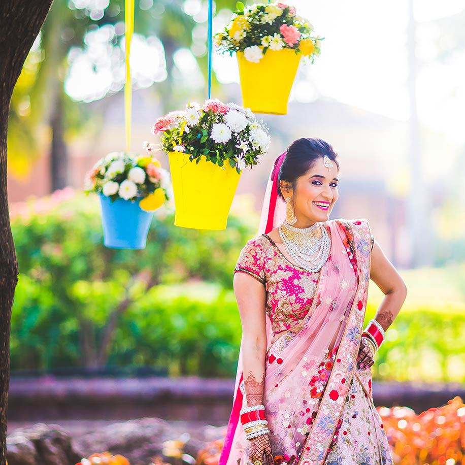 “The actual wedding ceremony was the event with the maximum focus, and the theme here was ‘dreamy’ and the colour scheme was mint green and pink with a hint of vintage. I chose a floral light pink lehenga by Varun Bahl with blooms across the entire skirt. Udit looked every inch a groom in a pastel green and gold Sabyasachi sherwani. He made an entry in a vintage car, while my entry was a dream come true! My brother held a pretty pink parasol over my head, and my sisters held mint green parasols over their heads as they accompanied me to the mandap. The baraat procession and celebrations took place in daylight, while the pheras were planned during the sunset hours.”