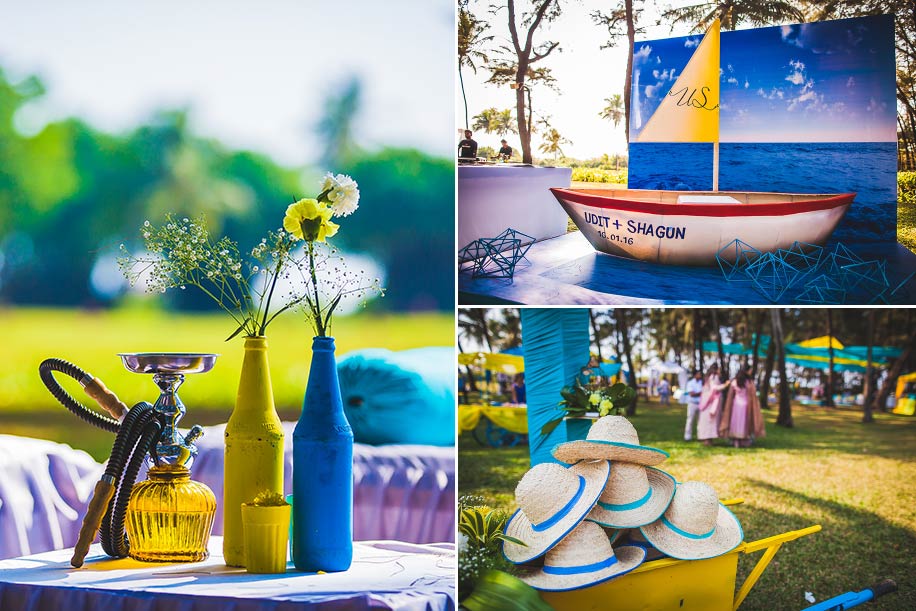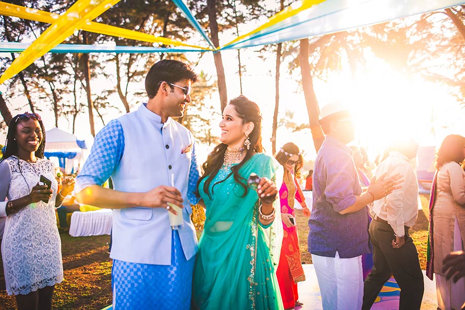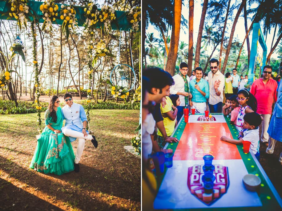 “Our wedding celebrations kickstarted with a Mehndi Sundowner, and this was a fun, casual event with an authentic Goan feel. The venue featured lots of palm trees, and the theme centred around teal, which is a greenish-blue colour, and yellow. My bridesmaids were clad in yellow, and I wore a green lehenga with elegant gold and silver thread embroidery and a light pretty dupatta.Udit wore a blue printed kurta ensemble with a Nehru jacket. Our outfits were designed by budding designers we personally know. We had lots of fun elements at the event such as beer pong, swings decorated with flowers and foliage, a custom-made bar menu, caricature artists and spa treats.” The lush lawns of the hotel were resplendent with teal and yellow accents such as divan cushions at the seating area, a blue bicycle with yellow marigold strands and pretty bottles on tables. Even the outfits of the dhol drummers featured the same vibrant scheme.