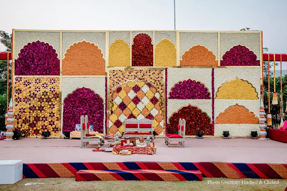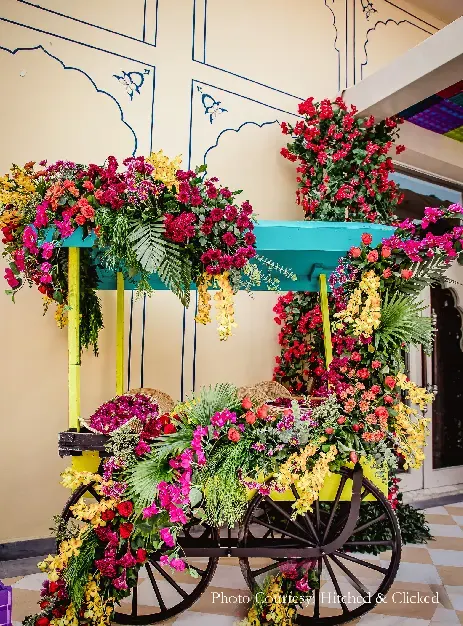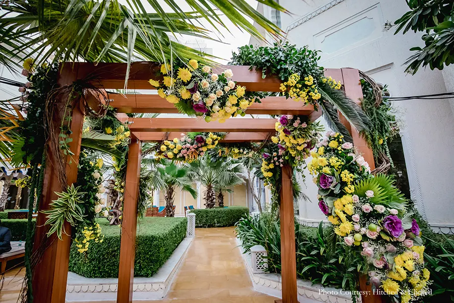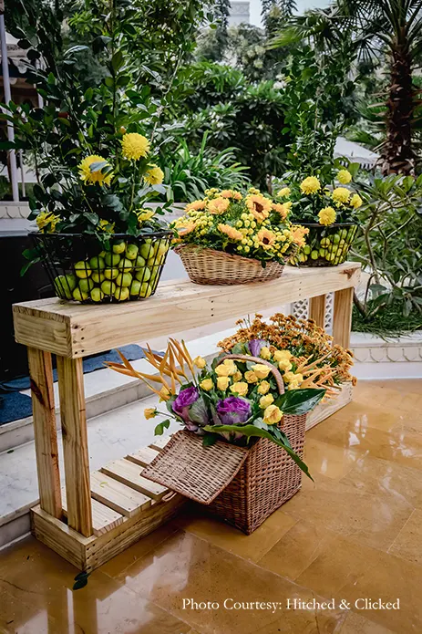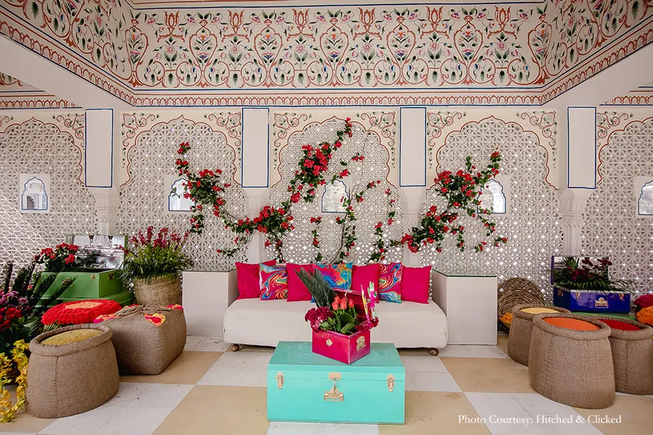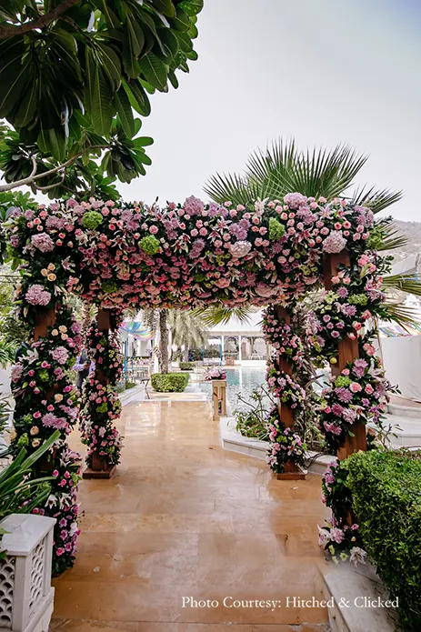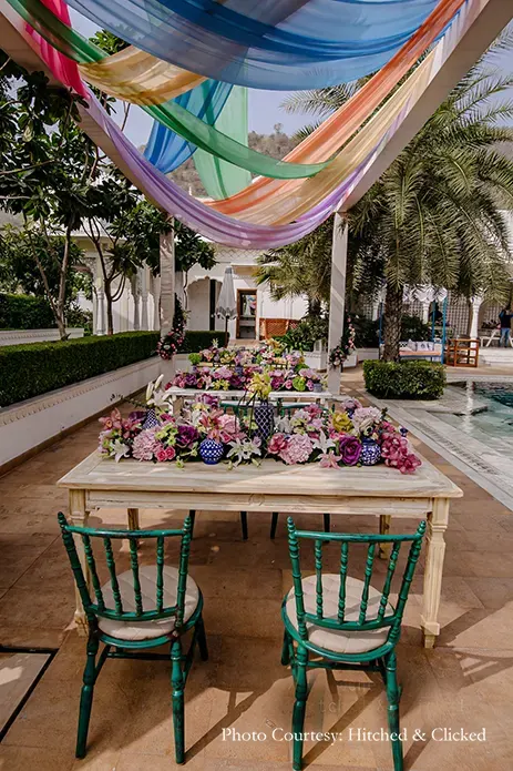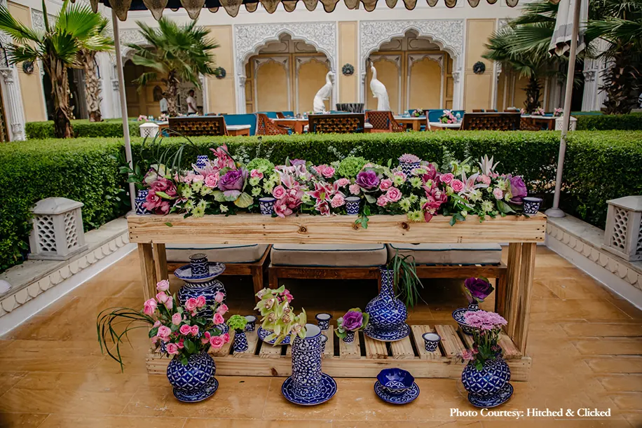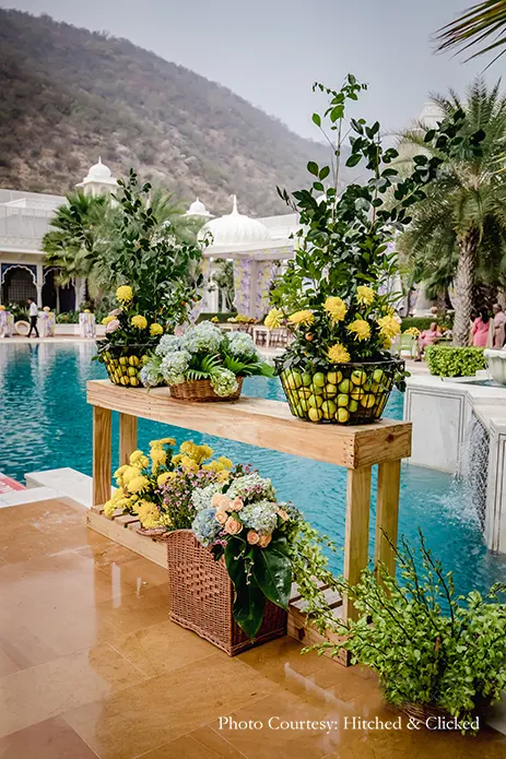 The festivities began on a vibrant note with a lively welcome lunch hosted by the poolside. The guests arrived to a true Rajasthani welcome with women dancing the Ghoomar, Dhol Nagaras and elephants. The bride and groom’s families dressed in hues of pink which beautifully complemented the decor with floral elements and arrangements made from lemons. Beautiful floral decorations decked every corner including the bar. After lunch, everyone got grooving to DJ Perisha’s tunes for a poolside party.