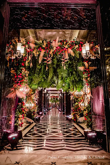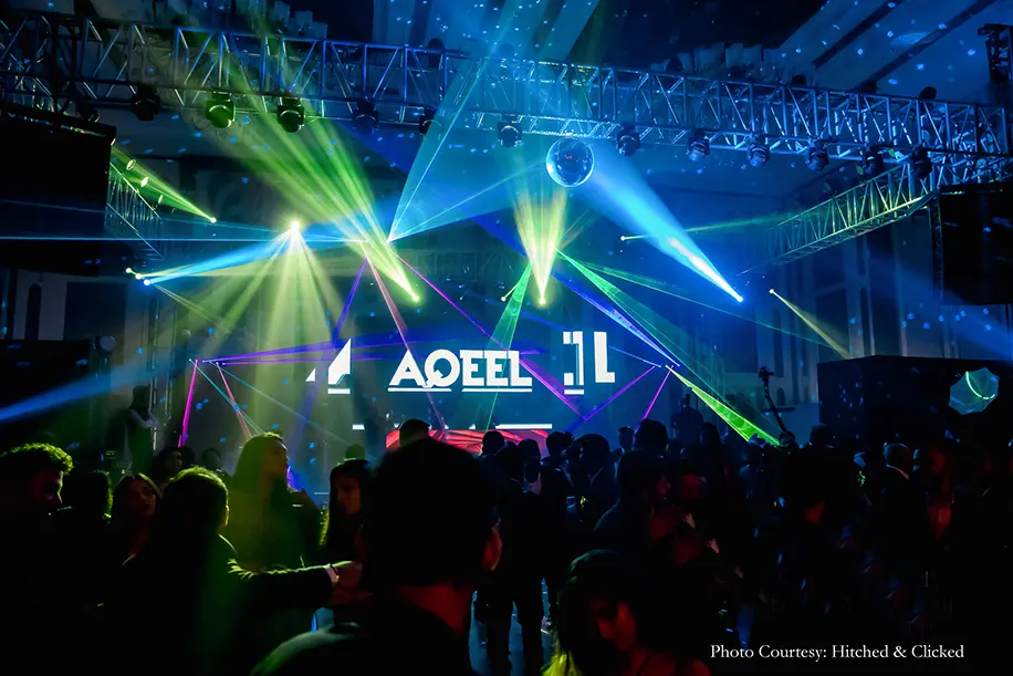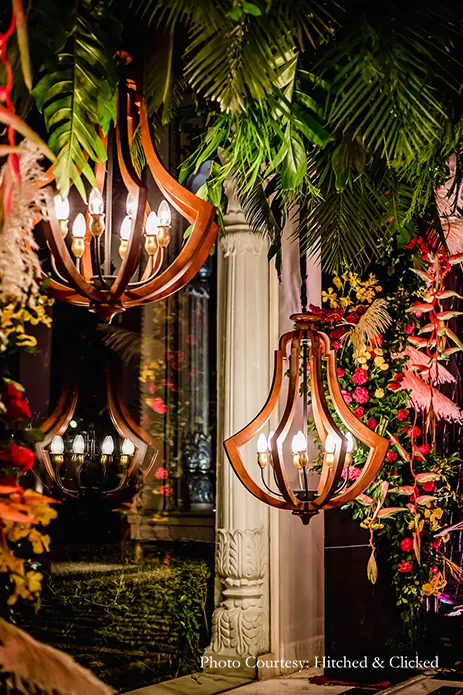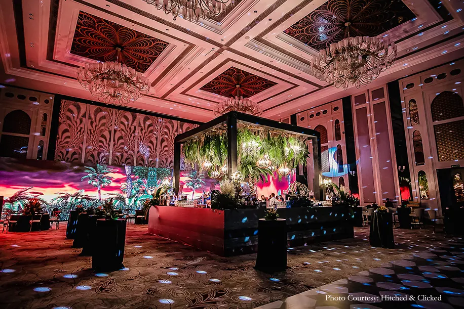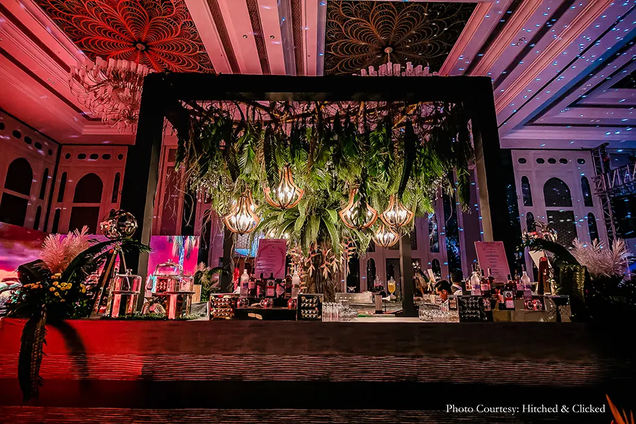 The cocktail night in the grand ballroom saw whimsical jungle-themed revelries. A glorious canopy of thick tropical foliage interspersed with glittering chandeliers, earthy wooden elements, LEDs and animal prints created a magical atmosphere. The island bar was lit with animal-themed and floral decor, couple hashtags, a personalized drinks menu & funky coasters. Everyone grooved to the tunes of the talented DJ Aqeel Ali.