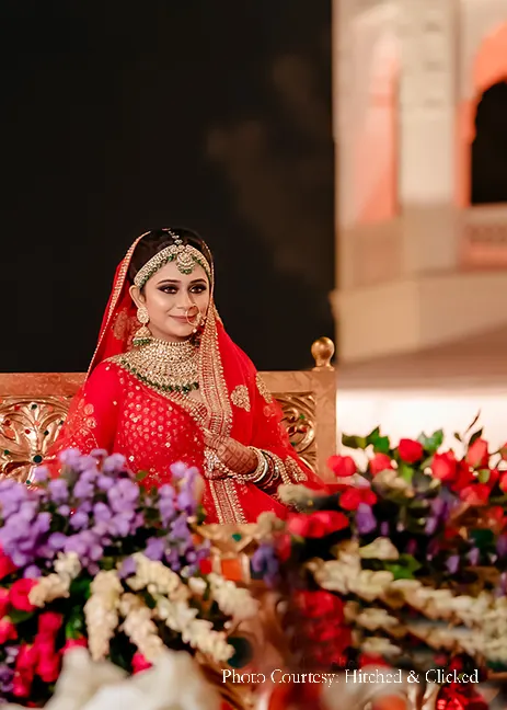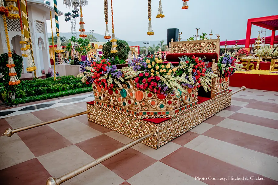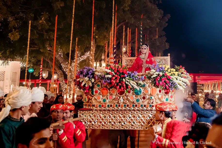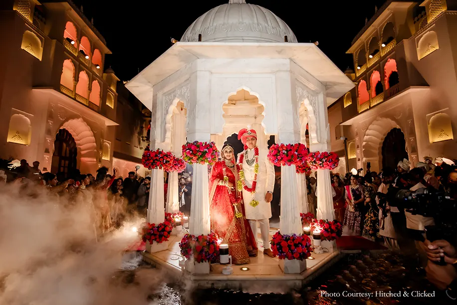 The wedding was planned in rich traditional hues of red, white and gold with flowers, candles, diyas and other decadent elements. Accompanied by Rajasthani dancers, the bride arrived in a traditional Doli decorated with flowers, following her friends and family who walked ahead holding diyas. As fireworks went off in a glittering milieu, the couple exchanged garlands in a traditional Jharokha.