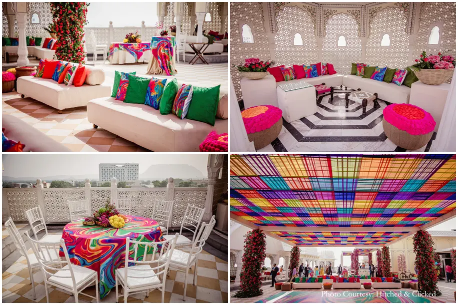 Hawa Mahal, the beautiful terrace venue with startling views of the surrounding mountains was the perfect spot for the Mehndi function. The vibrant colorful decor stood out against the intricate white architecture of the space. Bright floral arrangements in vases and baskets, eclectic props, quirky poufs and other seating options dotted the area. A special highlight was the Magical Painting Portrait where everyone wrote their messages for the couple, and once the whole canvas was filled, it turned into a beautiful portrait of the Couple. Mehndi artists, foot masseurs and an illusionist to interact and entertain the guests, all added to the fun of the occasion. The guests enjoyed delicious food and drinks as they took in the beautiful view and the melodious tunes of Singer Bhaven Dhanak & his team. The couple entered dancing to the beats of Dhol wallas and were joined by their families and friends on the stage as they danced to their heart’s content.