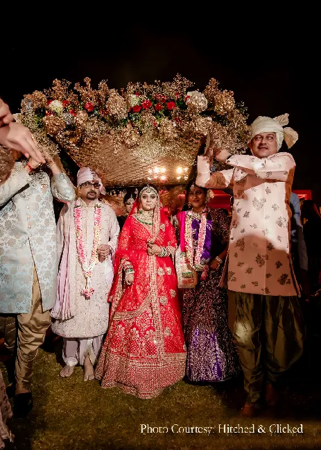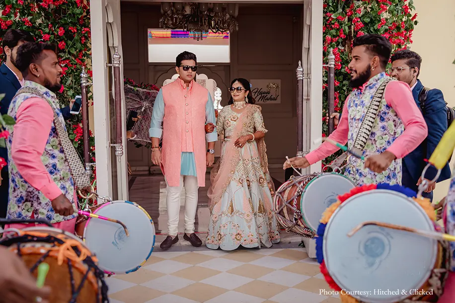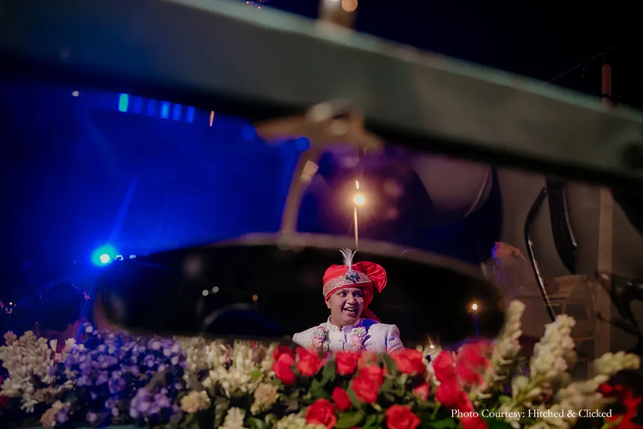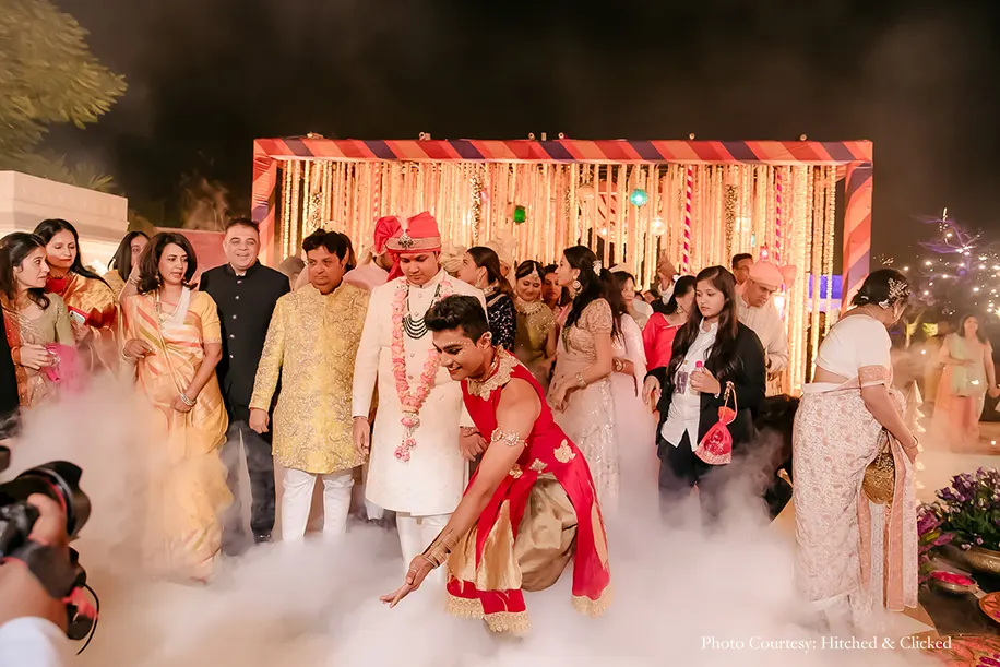 Accompanied by the tunes of DJ Lemon, the groom’s Safa ceremony & Baarat kickstarted the wedding revelries even as his baaratis enjoyed with Dhol beats and a mobile bar. A huge Baraat Truck was customized with the wedding logo & hashtag with DJ Lemon & Percussionist Dhruv (Mr. Probeat) performing to it. The groom arrived in a royal vintage car and was welcomed by the Bride’s side of the family.