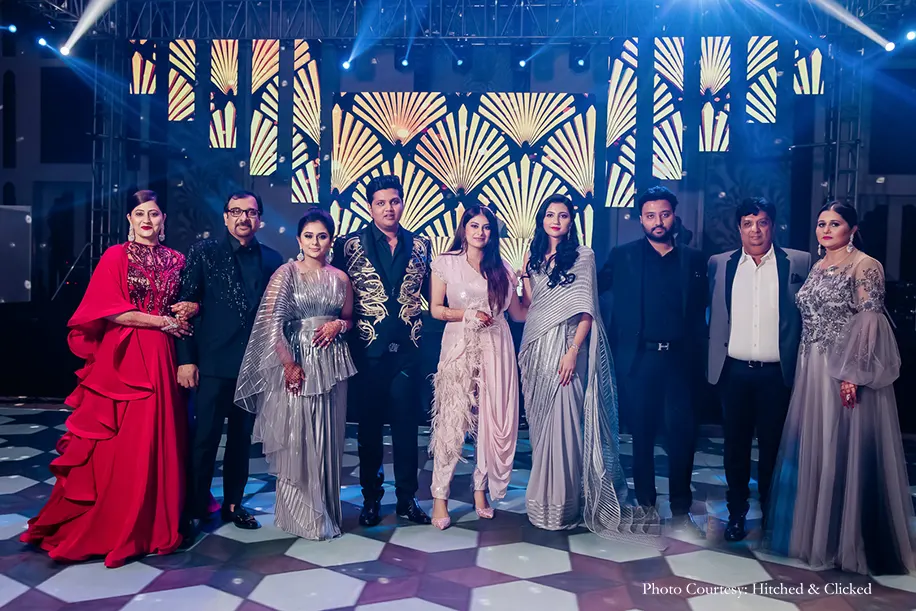The glitz and glamor of high tempo Sangeet festivities continued in the grand ballroom. Gleaming LED decor set the party mood for a night of dancing and musical revelry which began with some filler performances. The couple’s entry on a romantic number was followed by their solo and family performances. Singer Sukhbir Singh exuberantly brought the house down with his peppy Punjabi numbers.