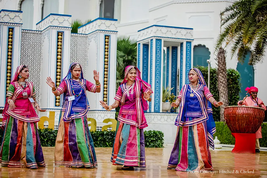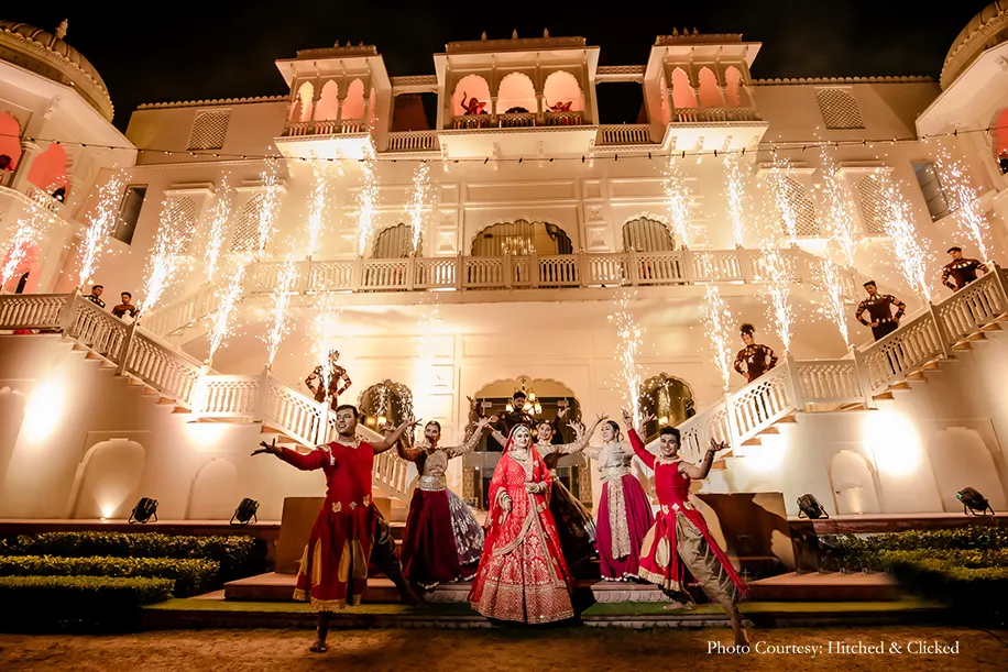 The groom looked princely as he walked down the regal courtyard steps towards the mandap amidst a display of fireworks, while the bride entered with folk dancers dancing around her. She then walked towards the Mandap under a Phoolon ki Chadar with her parents & sister. Sangeeta Muley & team performed for the wedding ceremony & phera geet. The ceremony was followed by 3 minutes of nonstop fireworks that concluded with a rocking after-party.