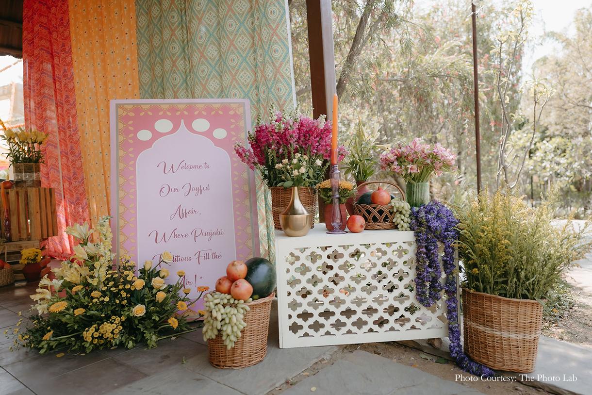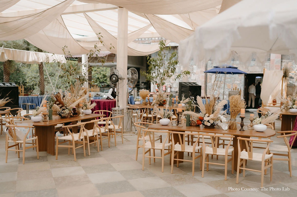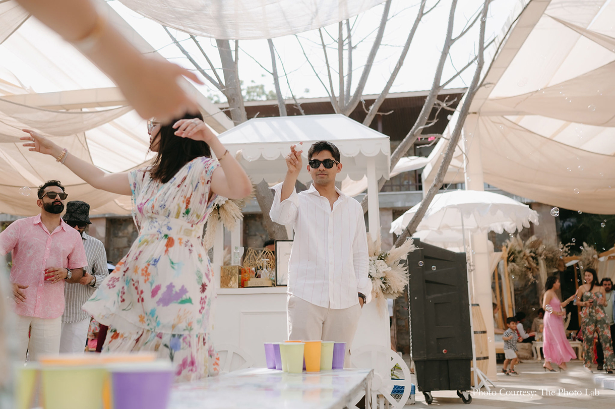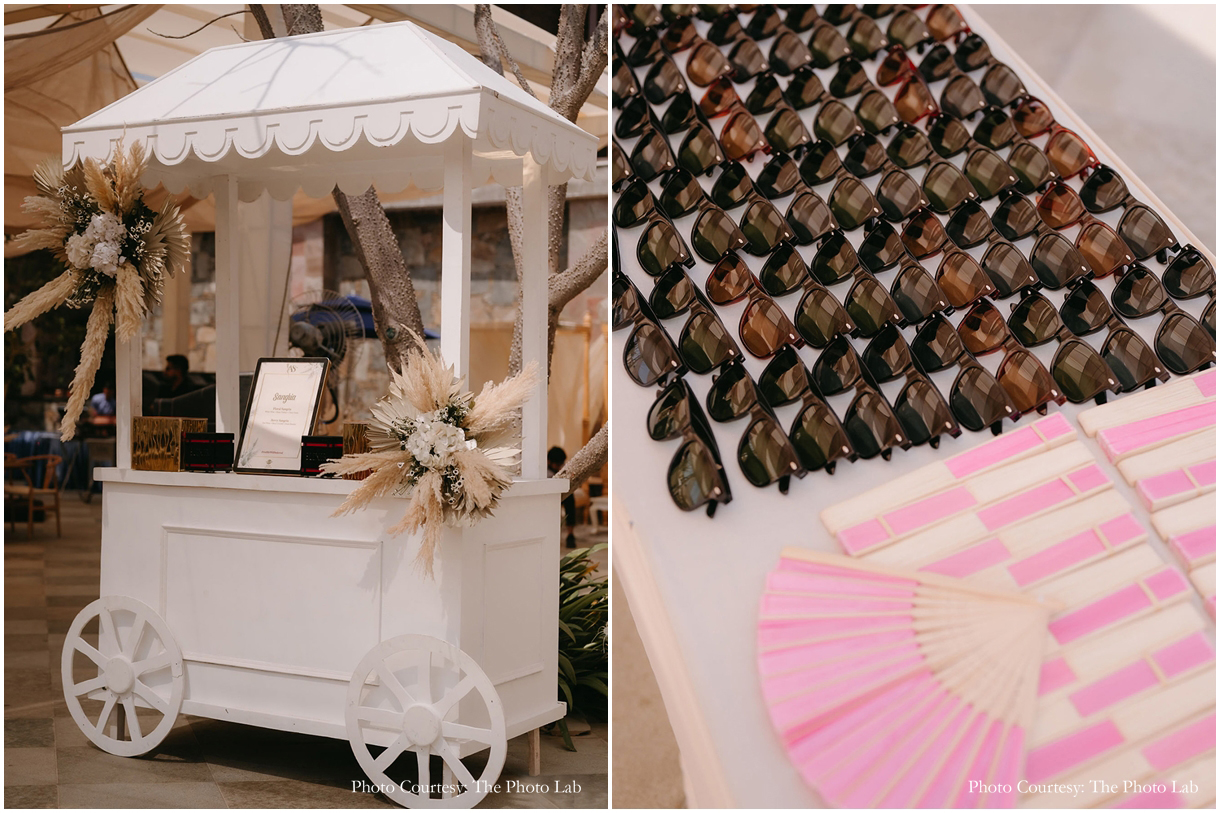 Against the backdrop of a shimmering pool, Shireen and Anmol’s welcome lunch and mehendi celebration radiated a relaxed yet lively atmosphere. The venue, adorned with earthy tones and terracotta accents, exuded a warm, rustic charm enhanced by lush greenery. Thoughtful giveaways like hand fans and sunglasses kept guests cool under the sun, while the vibrant pool area featured colorful floaties for relaxation and a spirited beer pong station near the bar. Mehndi artists skillfully adorned guests’ hands with intricate designs, complemented by a whimsical bubble machine that added a dreamy ambiance to the event.