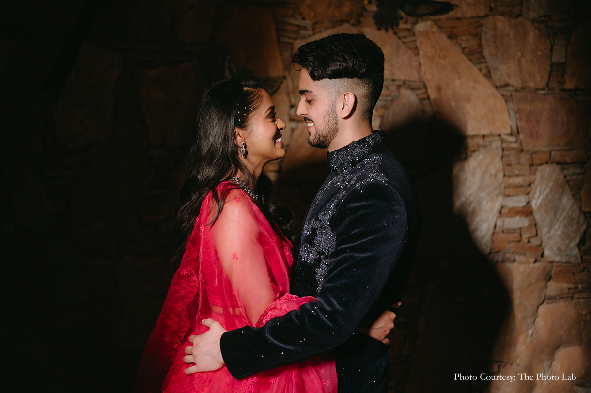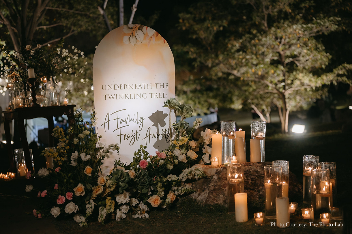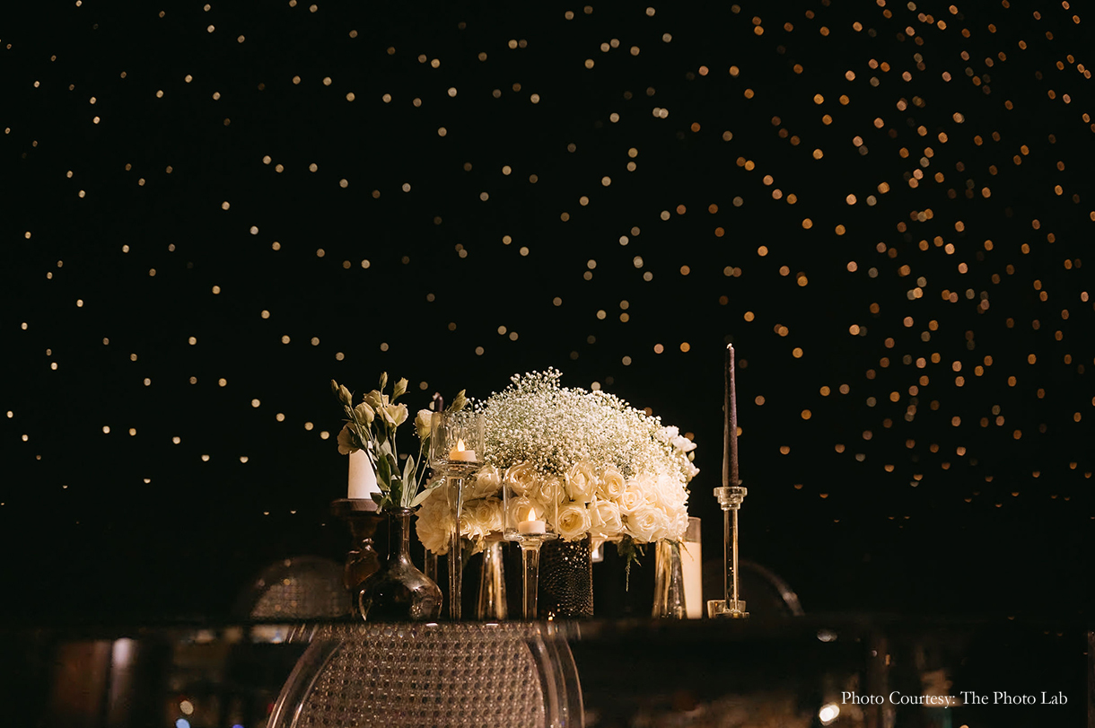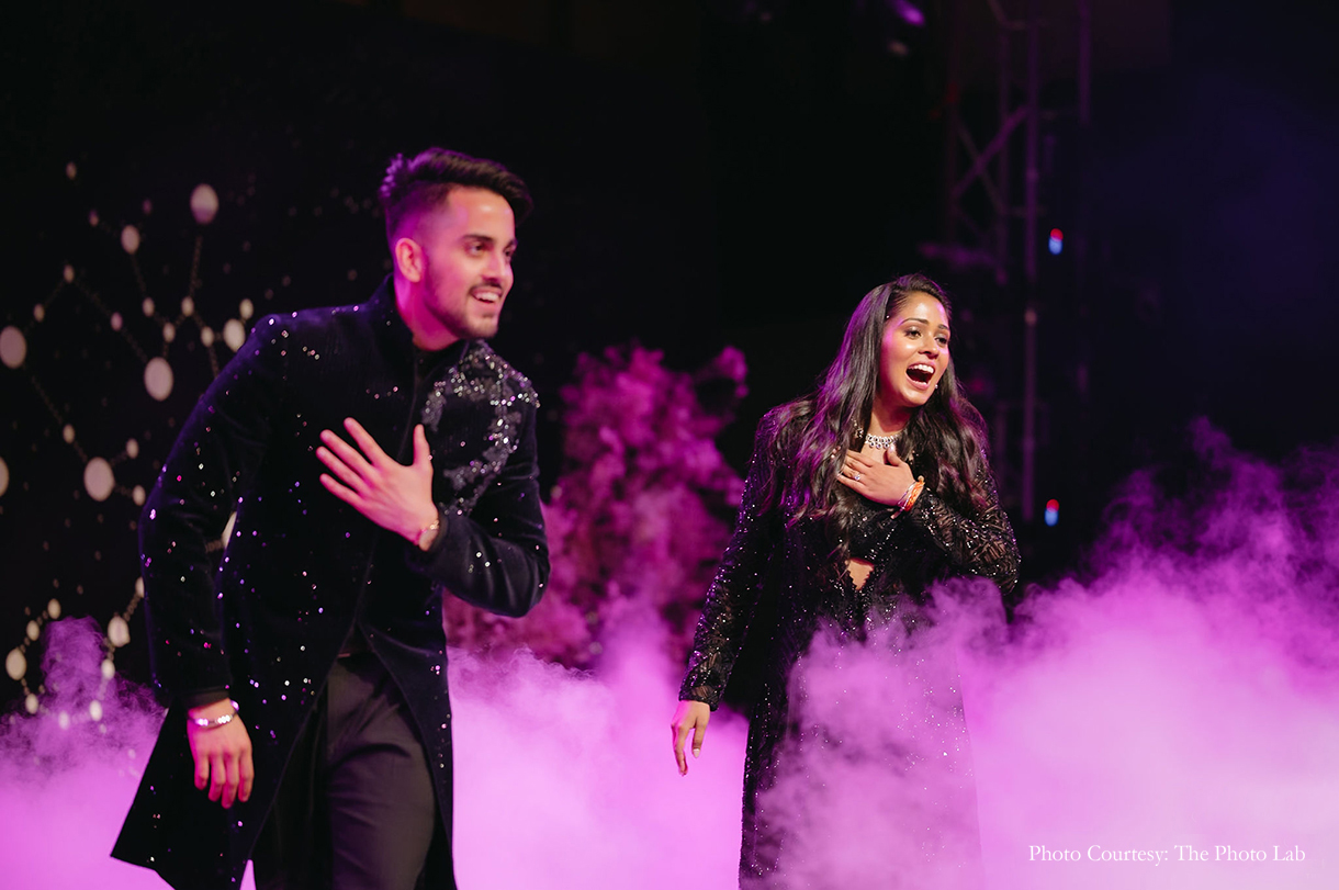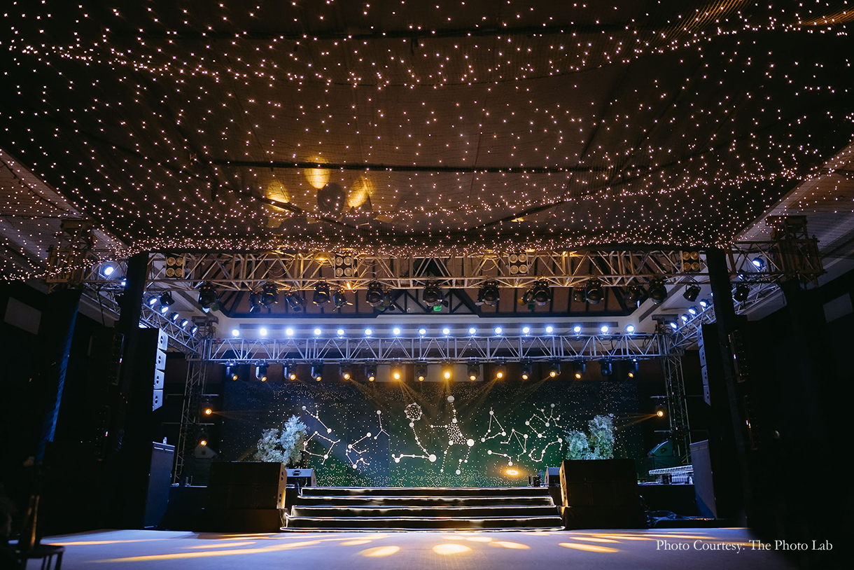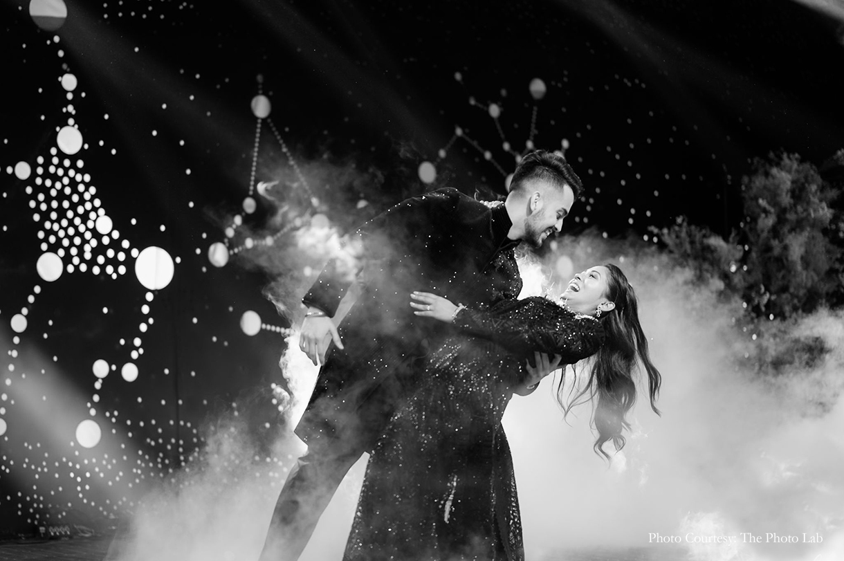 Shireen and Anmol’s sangeet night was a vibrant celebration, brimming with music, dance, and stunning decor that echoed their love for the cosmos. The venue dazzled with dramatic black decor and twinkling lights, creating an enchanting ambiance. A breathtaking stage backdrop showcased zodiac constellations, reflecting the couple’s passion for astrology and adding a personal touch to the festivities. The evening began with lively dance performances by friends and family, each a heartfelt homage to the couple’s journey. As the night progressed, DJ AJ’s futuristic holographic act elevated the after-party, ensuring everyone danced joyfully into the early hours.