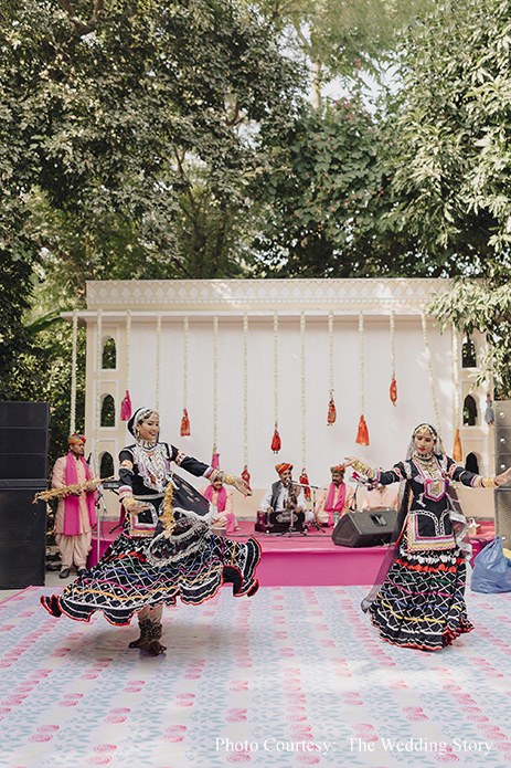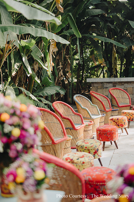Shivani shares, “For the mehndi we were quite specific about the decor and wanted it to follow a ‘Gujarat and Rajasthan Fusion’ theme that resembled a desi mela. We used a plethora of colors, our seats had a custom-made backdrop made with colorful patches of fabric which reminded people of the classic colorful quilts that are so often found in Indian households. Blooms placed in empty coke bottles, Indian pickle jars and dream catchers were interspersed across the venue. We had stalls such as balloon shooting, and live bangle-making along with vitamin c or khatta meetha stalls. The dance floor had live folk singers and dancers with a backdrop of ethnic puppets. Plus, dholis made sure everyone shook a leg!”