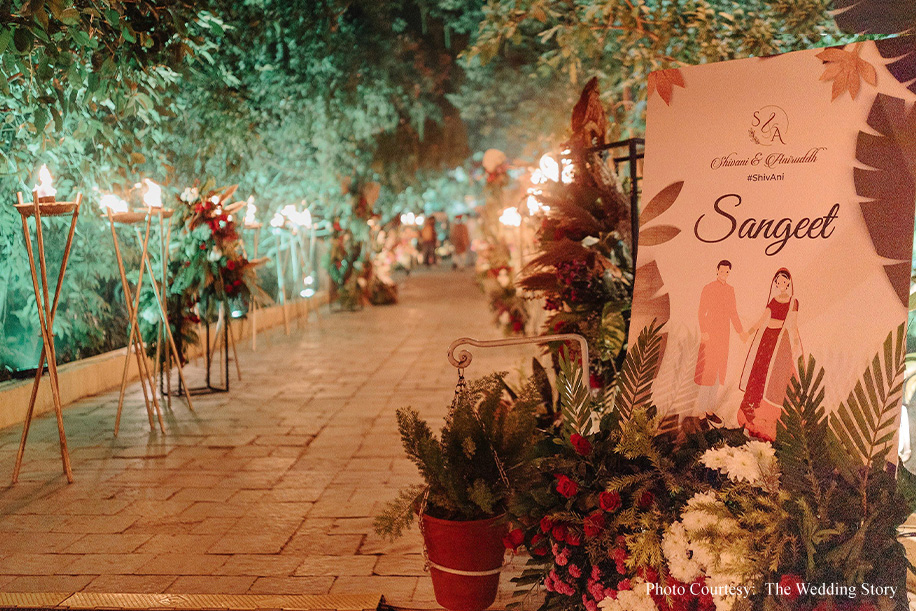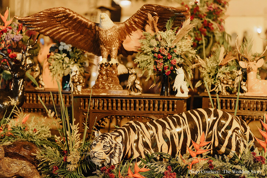 Shivani shares, “After a fun time at Mehendi, we wanted to take our guests on a small ride to ‘Ranthambhore Forest’ through our decor. So, we decided to recreate a forest for our sangeet. To give it a realistic look, the effigies of tigers, monkeys, birds, and deer were used. The entryway consisted of a walkway decorated with torches which led the guests to a dense forest. Animal sounds and various special effects of the jungle were also added to give the guests an impression of walking into a jungle. To make it a complete sensory experience we also implanted incense sticks that carried the fragrance of flowers, mud and herbs.”