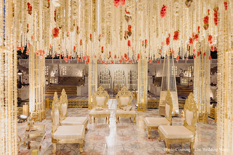 Shivani shares, “Our wedding has been in the making for the past two years and both of us are so thankful that it turned out exactly as we’d dreamed it would be! We were very keen on trying something new, to give the guests an absolutely unique experience. Hence, we chose the ‘Benaras’ theme which exuded a sense of serenity. The decor and lighting played a major role. Notes of tulsi, jasmine and patchouli gave the venue a heavenly scent while the white and gold color palette completed the look. The guests were requested to wear hues of red which looked stunning against the decor colors.”