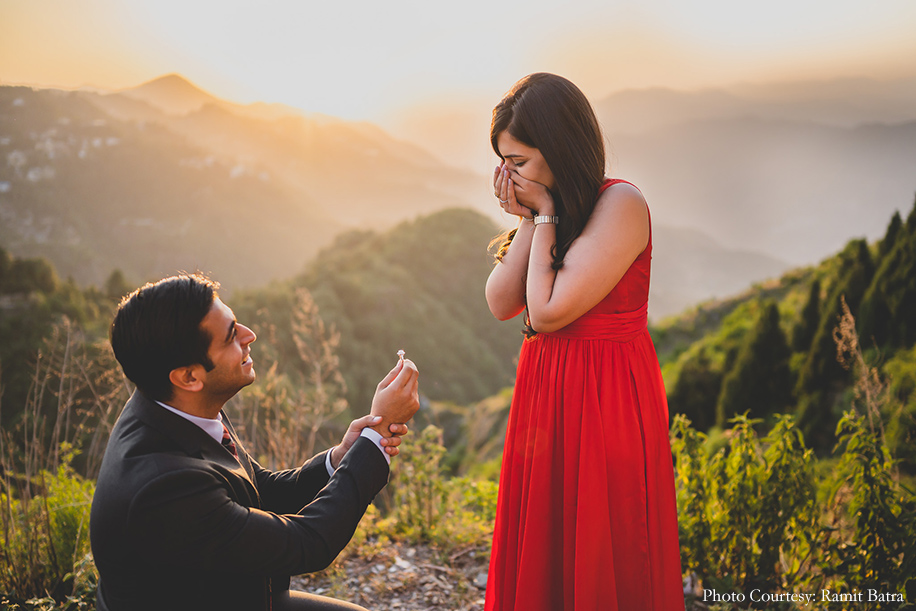 The happy bride recalls, “We spent months deciding on a design for my wedding ring. Ashish, being a jeweller, had already shortlisted three designs. I had always wanted a classic ring but Ashish said that from the time he first saw me, he knew he would get me a flower ring. I ended up choosing what he loved – a sunflower ring – which I will be proud to pass down to the coming generation. My excitement to see the ring mounted with each passing day. When we were in Mussoorie for our pre-wedding photoshoot by Ramit, we found the perfect cliff with a view of mountains. That’s when Ramit distracted me and Ashish went down on one knee, the ring in his hand. I couldn’t believe what was happening. At that moment, everything was perfect. The ring was the most beautiful engagement ring I’d ever seen.”