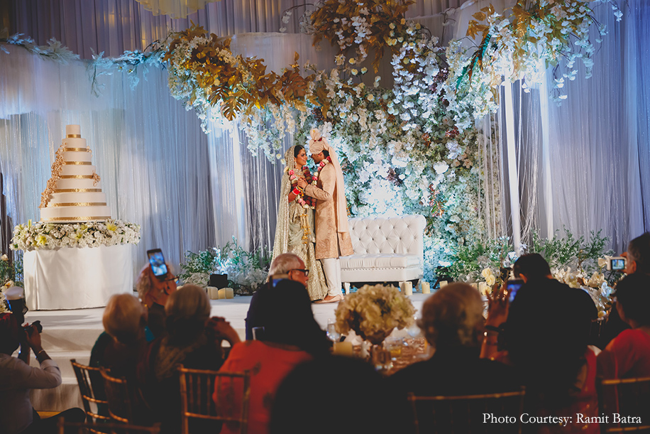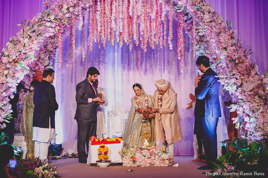 The couple exchanged wedding vows under beautiful arches of a mandap laden with flowers.