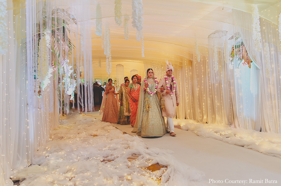 For their wedding, the couple picked four different venues for different rituals. The baraat saw Ashish enter the hotel in a vintage car wearing Achkan by Raghavendra Rathore. After the milni, all guests proceeded to the deck near the pier of the Chao Phraya River for the varmala. Shreya’s made her entrance in an authentic Thai boat, wearing a beautiful, pastel-green Sabyasachi lehenga.
