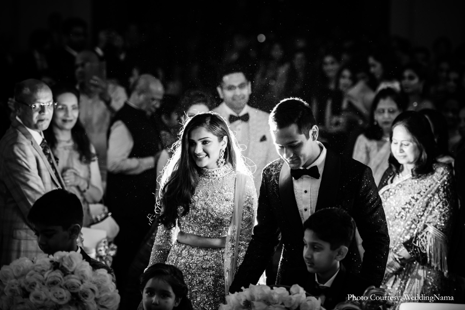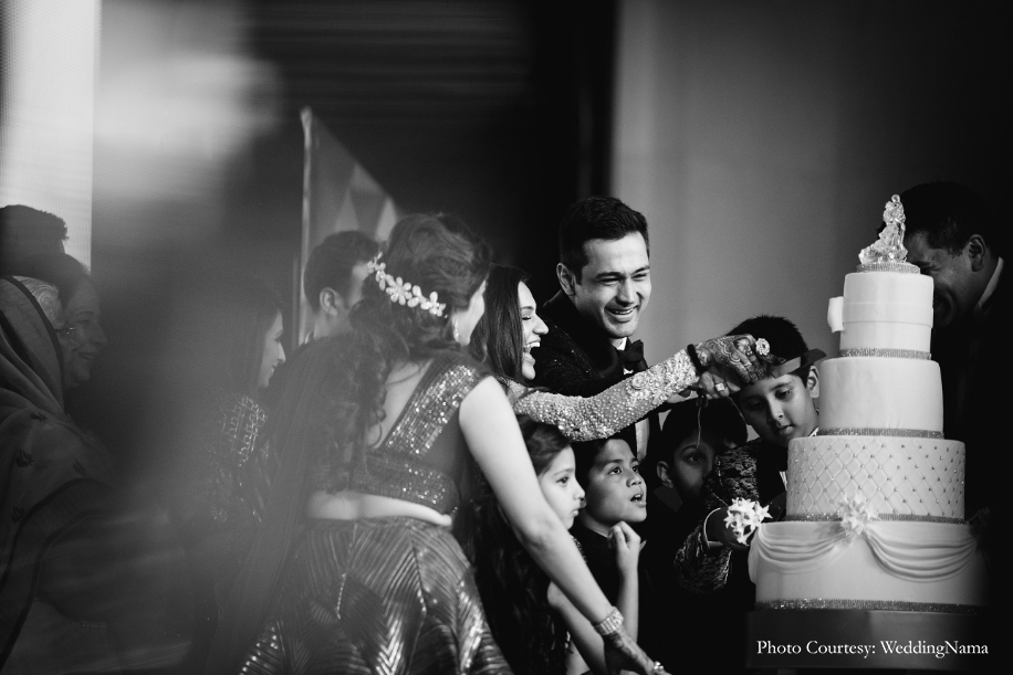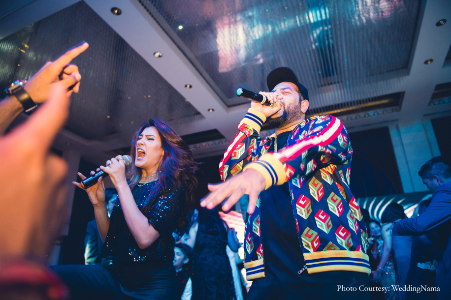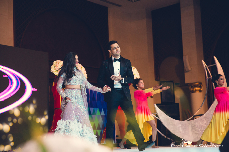 “The theme for our sangeet was ‘Wonderland,’ and this was an unstoppable dance party! We had performances by family and friends after which the floor was declared open for all to bring on their best moves. We had invited Badshah, and his music got everyone grooving. For this event, our guests had dressed up in gowns and suits/tuxedos. I opted for a stunning pink and white creation by Manish Malhotra while Labham wore a black tuxedo.”