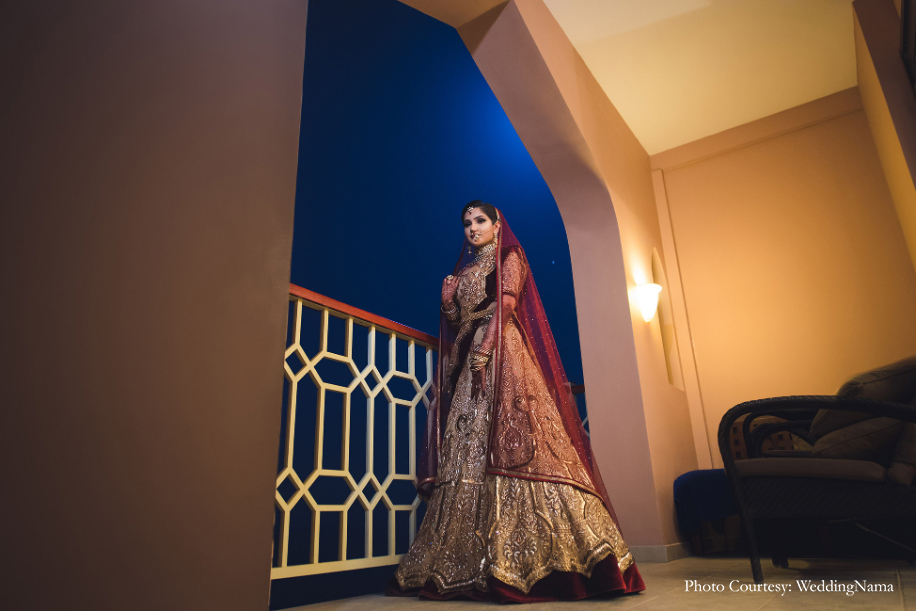 “This was an event held under the stars with purple and yellow lights projected on the walls of our venue. A golden and red lehenga by Tarun Tahilliani was my pick for this function, and Labham opted for a beige sherwani.”