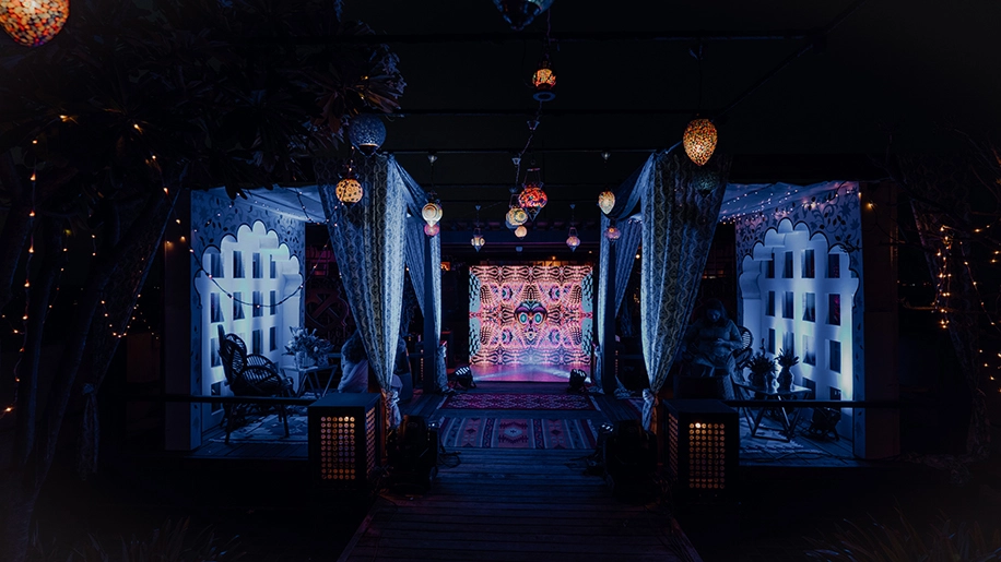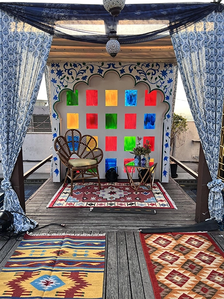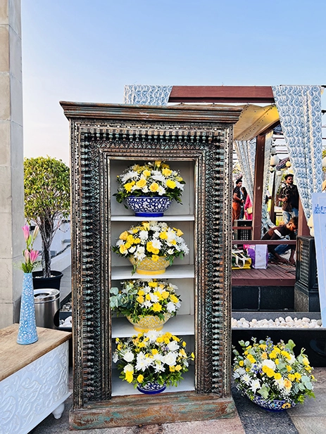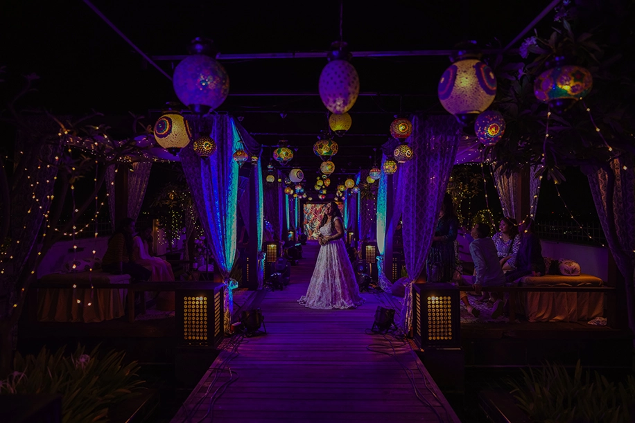Hosted at the rooftop Q-Bar at Hilton Chennai, the Mehendi function channeled the essence of Rajasthan. Inspired by the beauty of Hawa Mahal, the decor saw colorful stained glass, handpainted arches, traditional blue pottery, multicolored mosaic lamps, handwoven dhurries, and vibrant drapes and carpets, all of which were sourced from Rajasthani artisans. Stalls of tarot reading, bangle making, rice engraving, a perfume bar, and potli favors set a “haat” like ambiance for everyone to enjoy, offering a memorable experience to their International guests. In keeping with the earthy, traditional tone of the occasion, the couple flaunted statement pieces by Anita Dongre.