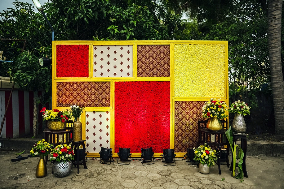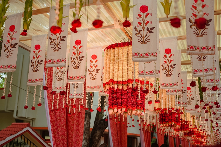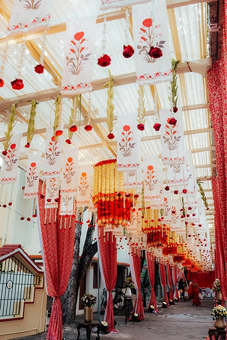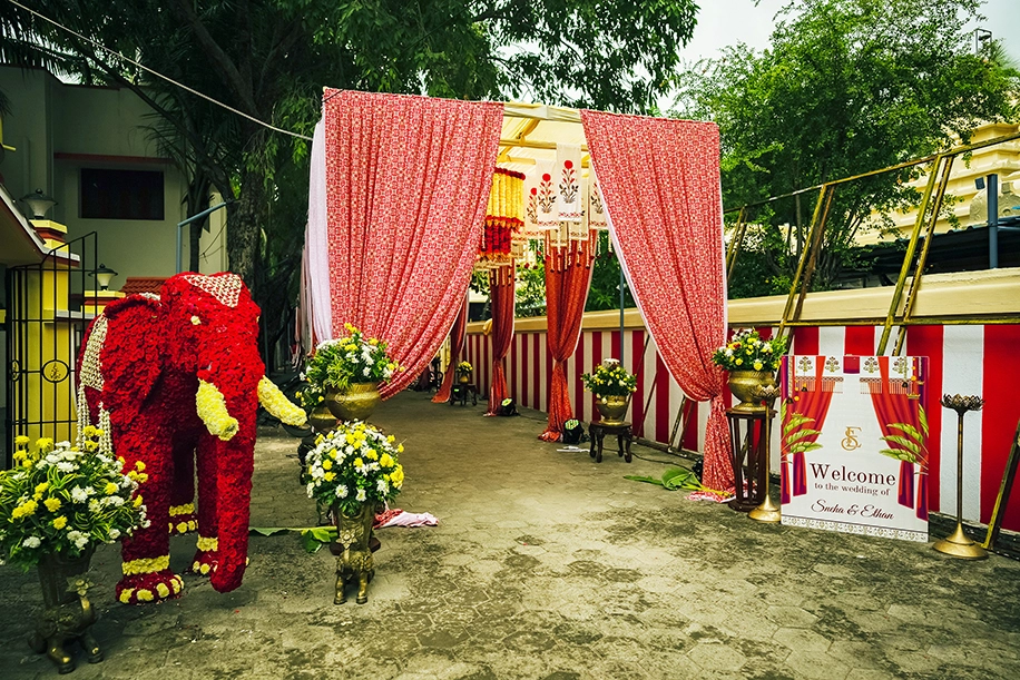 A celebration of Sneha’s Tamil heritage, the wedding ceremony hosted at her ancestral family temple was a tranquil blend of enchanting decor and traditions that gave their guests a taste of South India. Imagined entirely in hues of red and white, the decor transported the guests to another realm as they entered a stunning walkway of patola drapes, floral chandeliers, and motif fabric danglers. An extension of the walkway decor, the photobooth offered a chance for some memorable pictures while a six-foot tall floral elephant installation greeted the guests as they walked towards the mandap. Built with Chettinad pillars and a floral backdrop of Meenakshi Sundareshwar artwork, the mandap was a nod to Karaikudi, where the couple had done their pre-wedding shoot. The mandap canopy of densely packed floral string scallops also recreated the auspicious Meenakshi Sundareshwar Kalyanam at Madurai.