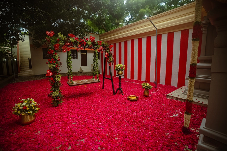 For the Oonjal (Swing) ceremony, a traditional South Indian swing decorated with anthuriums for a modern touch was set up amidst a sea of red rose petals that completely covered the temple portico floor. The experience was no less than a dream!
