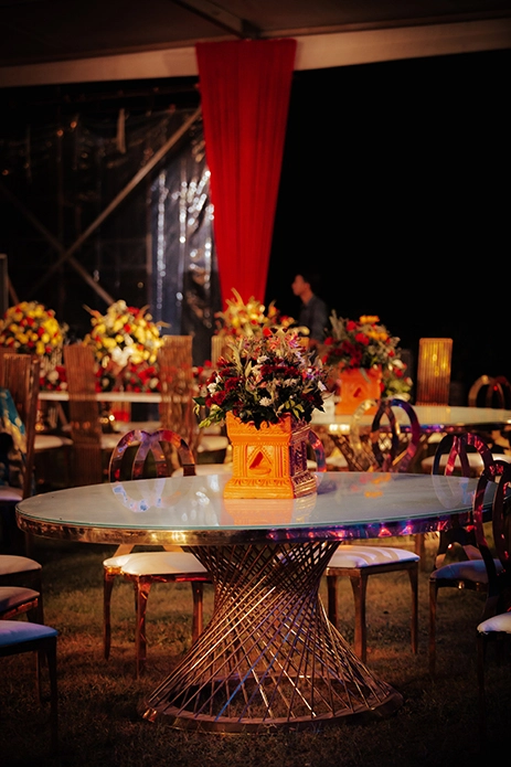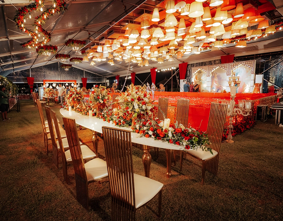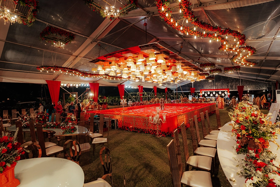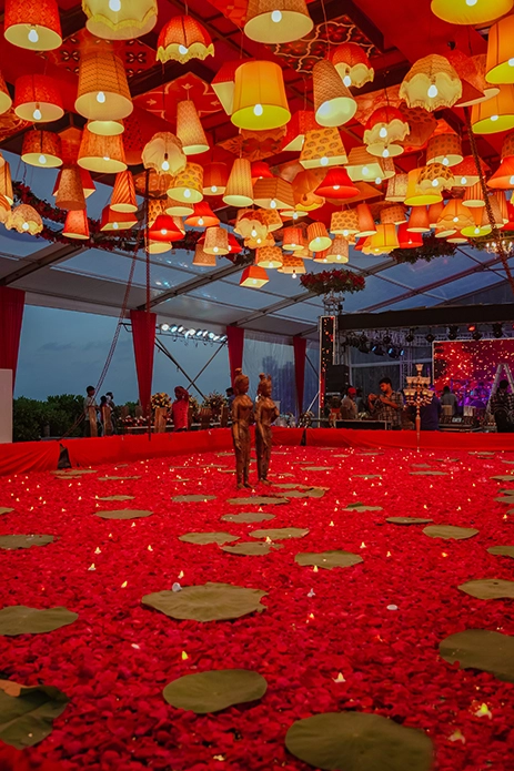 The festivities came to a splendorous end with an evening Reception at InterContinental Chennai Mahabalipuram Resort. To give an informal feel to the evening where they could walk around the venue, the decor recreated the concept of a Pushkarini – a central temple waterbody. Filled with lotuses, rose petals, and diyas, the breathtaking water structure was surrounded by table seating for an ethereal ambiance. It was also surrounded by LED diyas for guests to set afloat on the water, while a canopy of custom-made fabric lamps, red roses, and crystal chandeliers hung overhead.