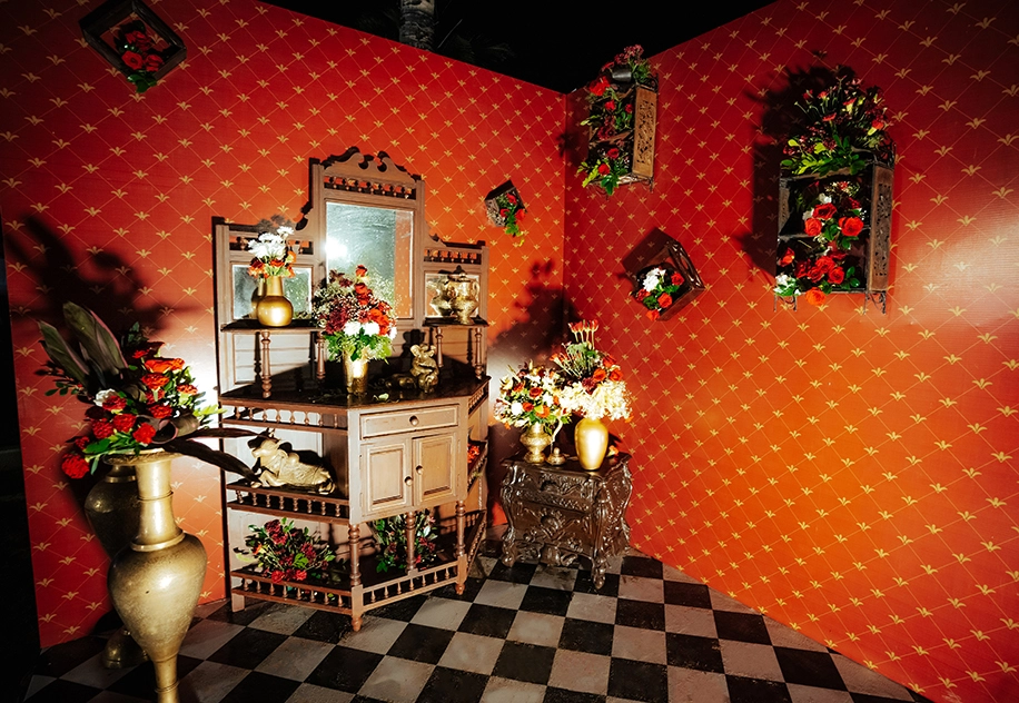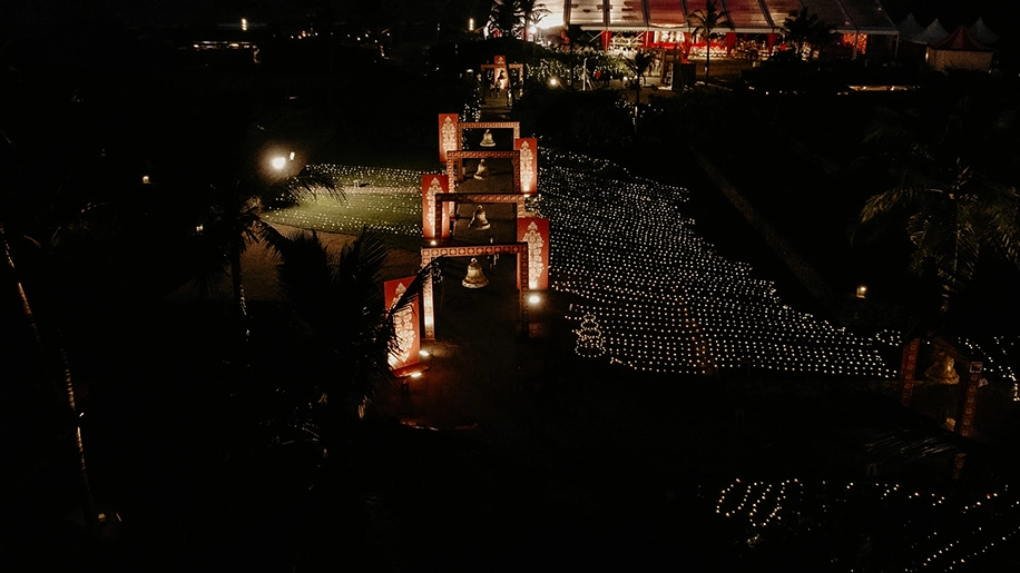 While the occasion in itself was nothing short of magnificent, even more, personal touches were added to make the evening truly unforgettable. From the rooms to the venue, ten arches created the Kanchivaram silk route, with each arch telling a unique story. The photobooth recreating a women’s dresser complete with mirrors and a Chettinad Athangudi tiled floor was a nod to Karaikudi again. The evening ended with a pyrotechnic display on the beach to mark the momentous celebration they had all experienced, and the guests returned with hand-painted Pichwai plates to remind them of it for the rest of their lives.