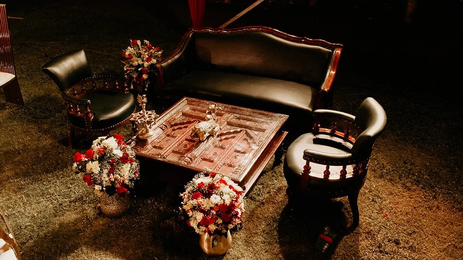 The couple corner was flanked by famous Raja Ravi Varma paintings – Hamsa Damayanti, Radha in the Moonlight, and Kadambari, along with terracotta horses for a stunning sight. More terracotta props such as tulsi planters, elephant figurines, and floral runners on tables added an earthy feel, while teakwood sofas, engraved statement teapoys, gramophones, brass work like Nandhis, and flower vases added a vintage charm. The bar counter featured prints of famous South Indian musical instruments and a backdrop of cascading crystal chandeliers leading to the stage where musicians Rajesh Vaidya and Abhijit Nair entertained the guests with their magical performances.