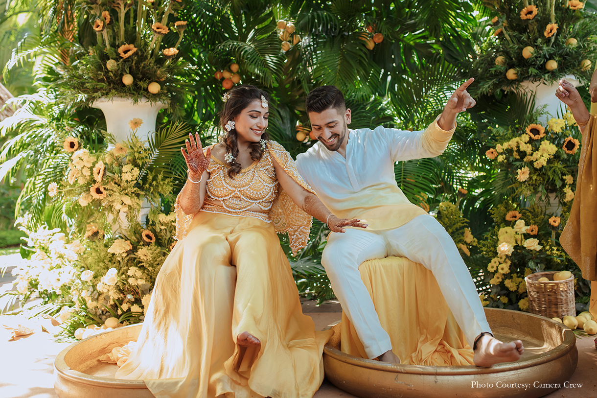 The 3-day festivities kicked off with an intimate haldi soiree full of fun and family love. The Tuscan-themed occasion saw the refreshing decor of sunflowers, foliage, and lemons, as everyone gathered around the couple to smear them with haldi and shower them with petals and water. The bride looked radiant in a yellow co-ord set and floral jewelry, while the groom stood out in a stylish ombre yellow and white kurta jacket set.
