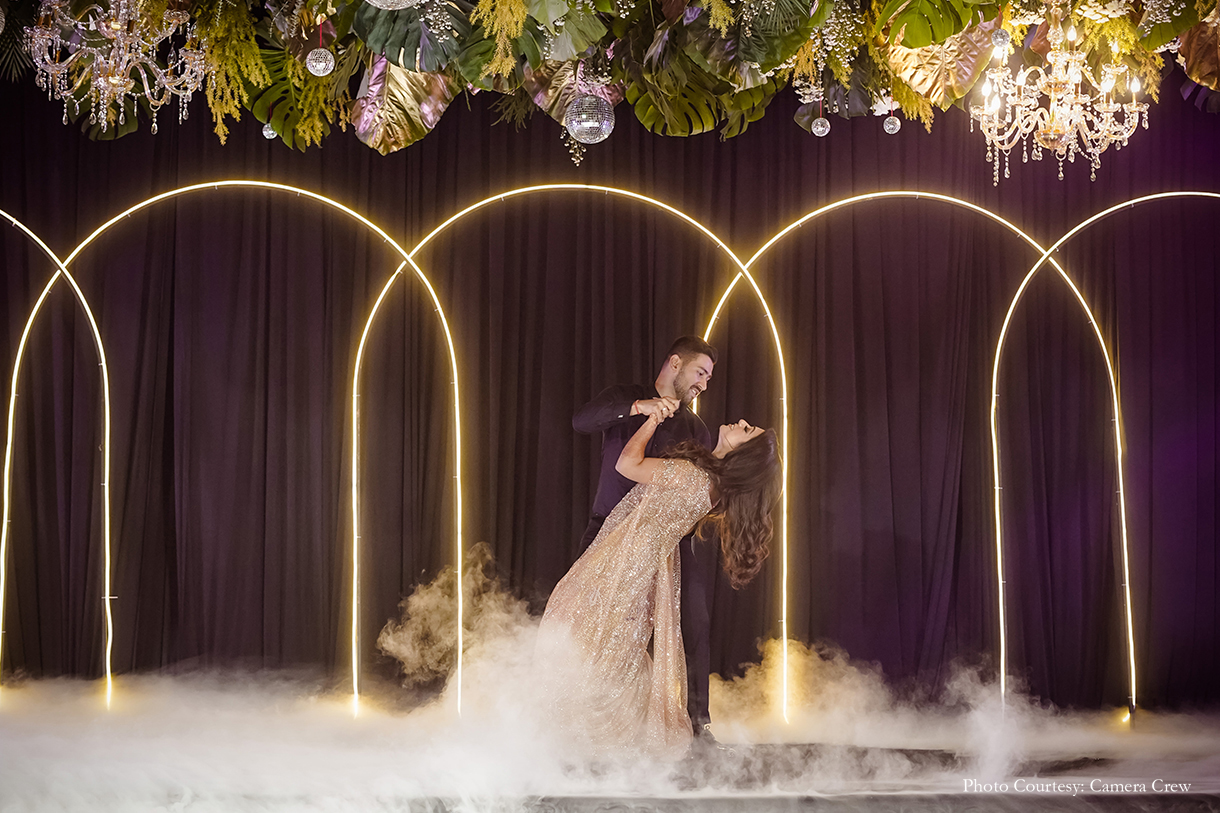 The quirky vibrance of the day gave way to some glitz and glam for the Sangeet night! After being welcomed by a champagne wall as they entered, the guests were treated to a night of dazzling performances, music, dancing, and non-stop entertainment. The bride wore a shimmering gold couture gown while the groom sported a suave velvet green tuxedo, both of which matched the exotic color palette of the decor and canopy of disco balls and foliage.