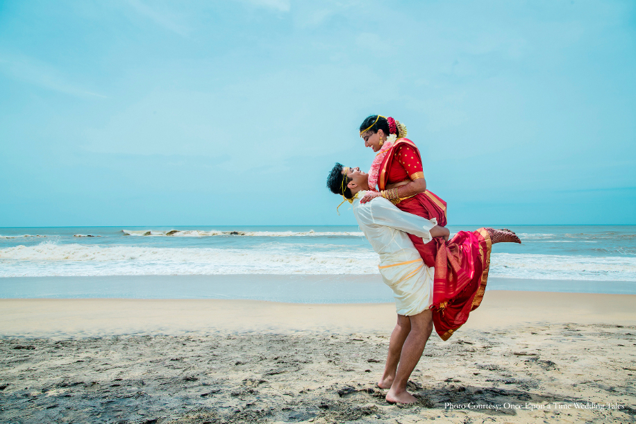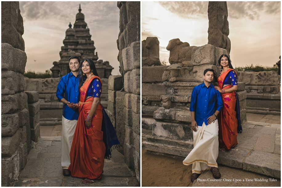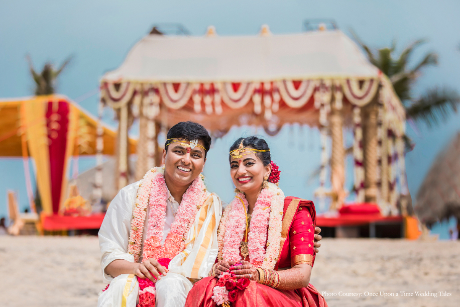 “I grew up in the U.S. but I’ve always been a desi girl. Most of our family is still in India so we wanted to have the wedding there. Dhinesh and I are both from Tamil Nadu so it made sense to have the wedding near Chennai which is easy for people to fly into. With only an hour to drive to it, we decided to go with a destination beach wedding in Mahabalipuram with elements of a traditional Tamilian wedding.