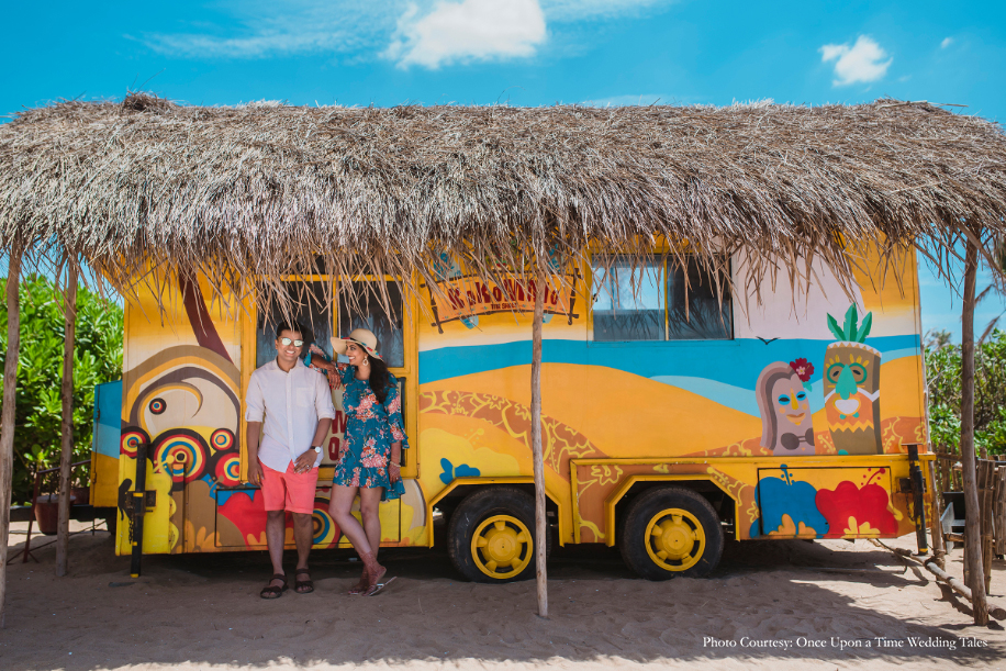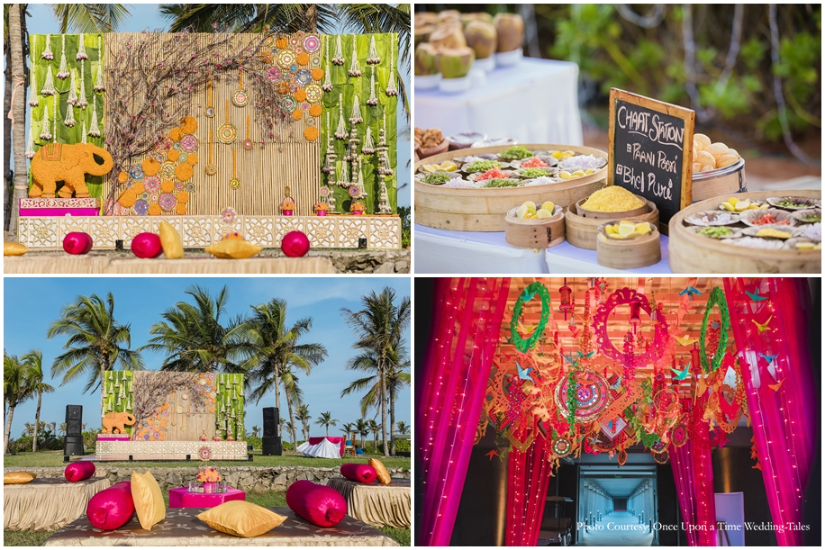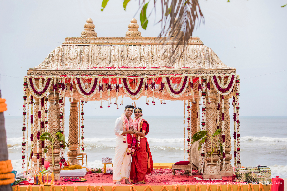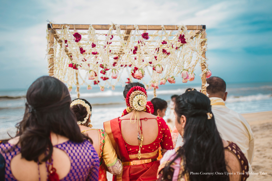 The entrance was a vibrant tunnel structure lined with yellow and pink drapes. I walked through to the wedding mandap under a beautiful flower chaddar held up by my bridesmaids, led by my paternal aunt and uncle. Before entering the mandap, all of our guests stood on either side, showering me with their blessings and rose petals. The mandap was a traditional temple structure, beautifully decorated with red, orange, yellow, and white flowers with 2 fresh banana trees at the entrance. The open temple structure allowed for a nice cool breeze to come in from the beach, adding to the magic of the wedding day. The bright colors on the beach were a perfect match for the most perfect day ever. As he tied the thaali (wedding necklace) around my neck, approximately 30 kgs of rose petals were showered onto us. After the rituals, we had a traditional Tamilian ‘elai saapadu’ at Samaya.”